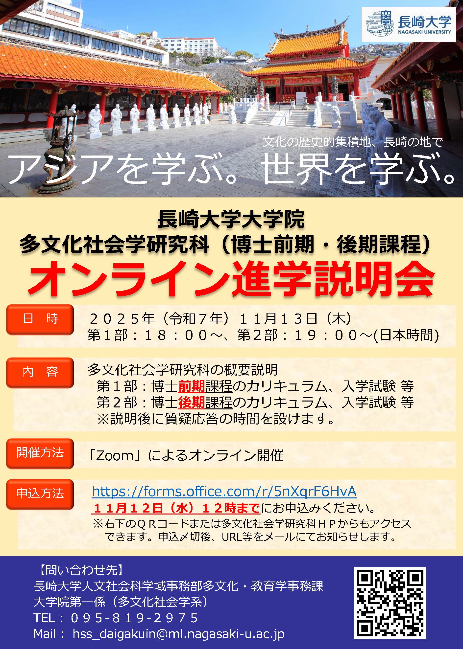 長崎大学大学院多文化社会学研究科では、博士前期・後期課程への進学希望者を対象にオンライン進学説明会を開催します。進学をお考えの方はぜひご参加ください。