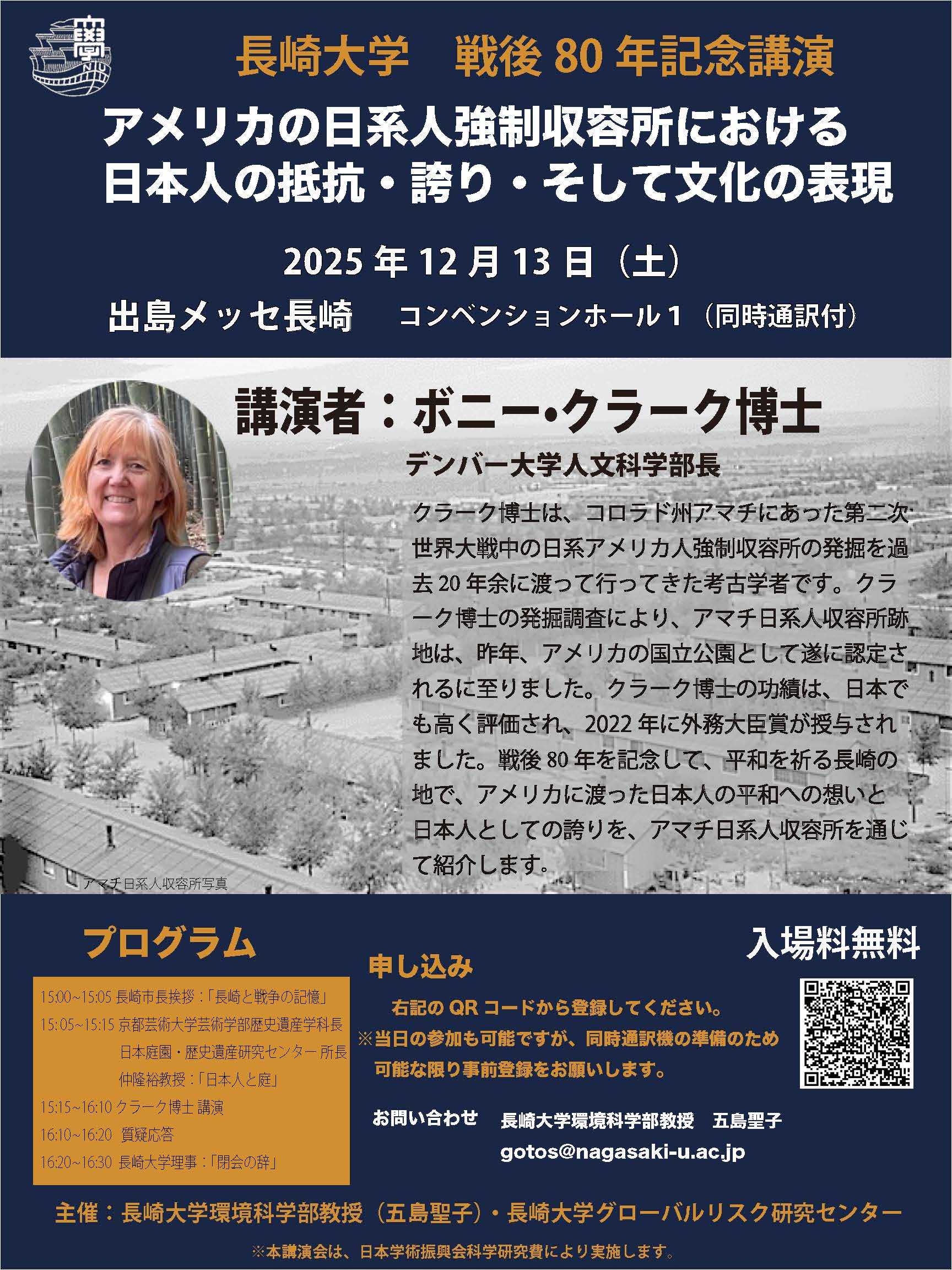 日時:2025年12月13日(土) 15:00~16:30 会場:出島メッセ長崎 コンベンションホール1 (長崎市尾上町4-1) プログラム: 15:00~15:05 長崎市長挨拶「長崎と戦争の記憶」 15:05~15:15 京都芸術大学芸術学部歴史遺産学科長 日本庭園・歴史遺産研究センター所長 仲隆裕教授「日本人と庭」 15:15~16:10 クラーク博士 講演 16:10~16:20 質疑応答 16:20~16:30 長崎大学理事「閉会の辞」 言語:英語(同時通訳付) 参加費:無料 申込: 添付の二次元コードまたはこちらをご確認ください。 お問合せ: 長崎大学環境科学部教授 五島聖子 Mail:gotos*nagasaki-u.ac.jp ※*を@に置き換えて送信してください。