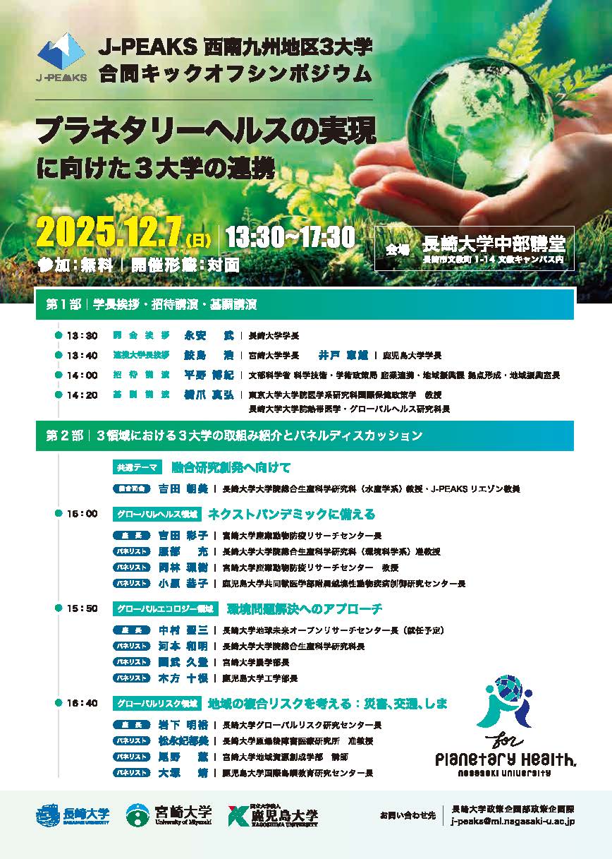 長崎大学は、令和6年度文部科学省「地域中核・特色ある研究大学強化促進事業(J-PEAKS)」に採択されました。この事業の一環として、2025年12月7日(日)に長崎大学中部講堂にて、本事業の連携大学である宮崎大学・鹿児島大学と西南九州地区3大学合同キックオフシンポジウムを開催します。