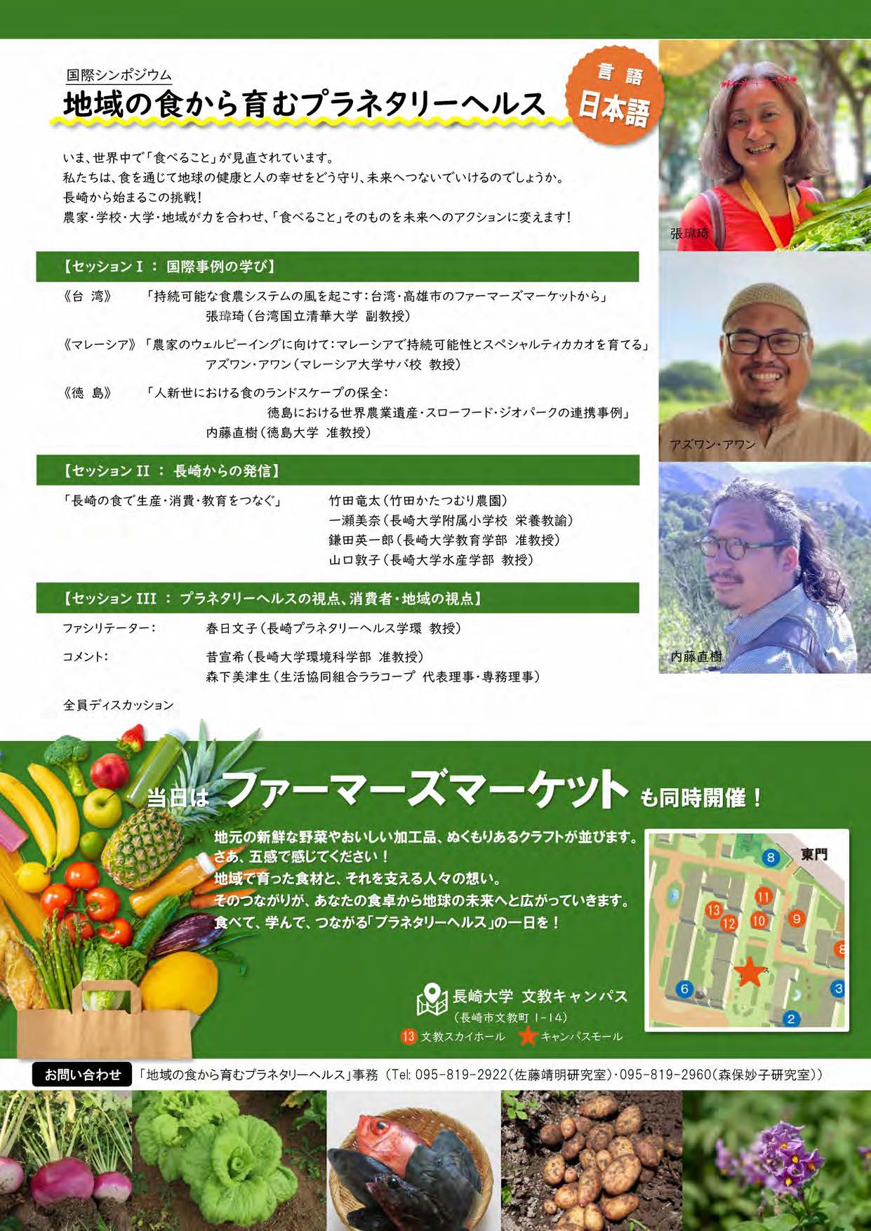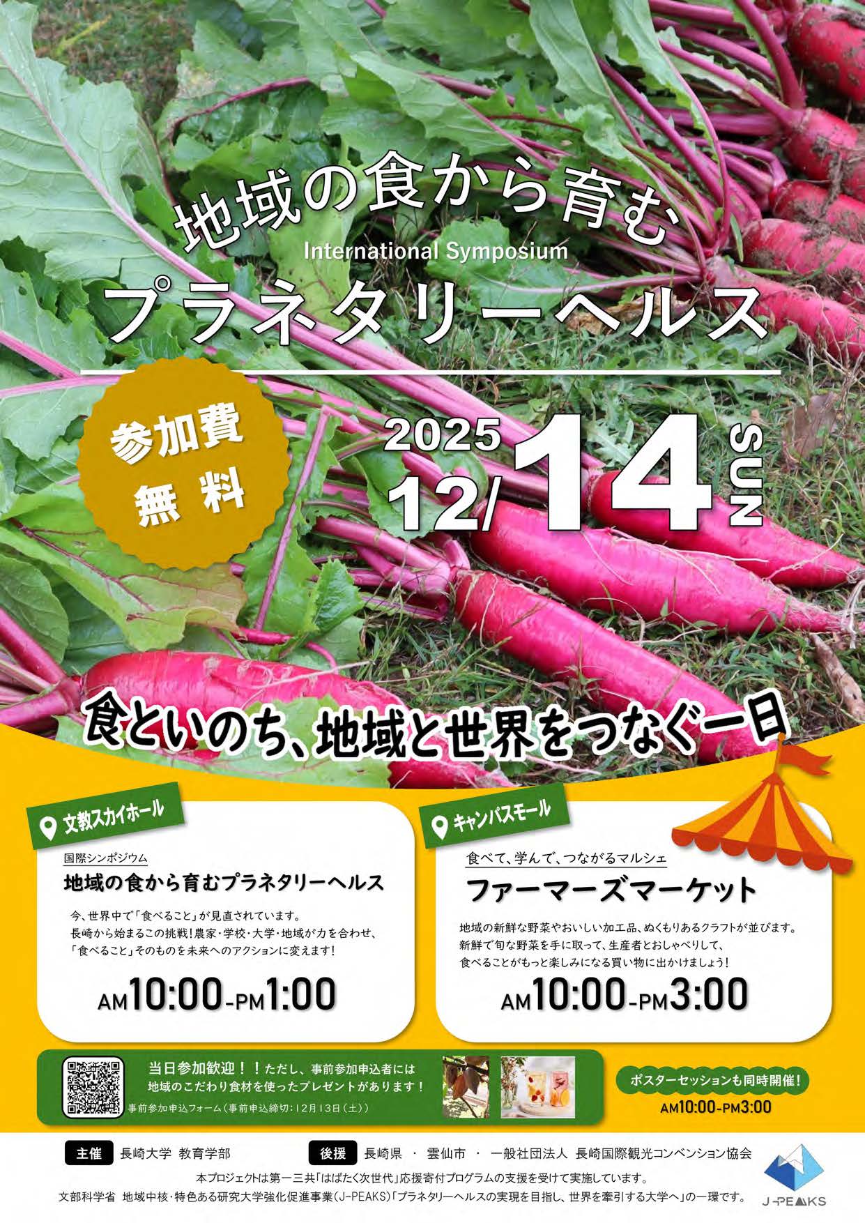 教育学部では、学術的な研究と地域社会の力を結びつけ、「地域の食からプラネタリーヘルス」を育むための国際シンポジウムを開催します。台湾・マレーシア・徳島から専門家を招き、持続可能な食の取り組みを紹介するとともに、長崎の生産者や食育現場、研究者そして消費者が一体となり、食を通して地域の未来を考えます。当日は、国際シンポジウムのほか、ファーマーズマーケットやポスターセッションなど、一般市民の方々が「見て・食べて・語れる」体験型のプログラムも用意しています。