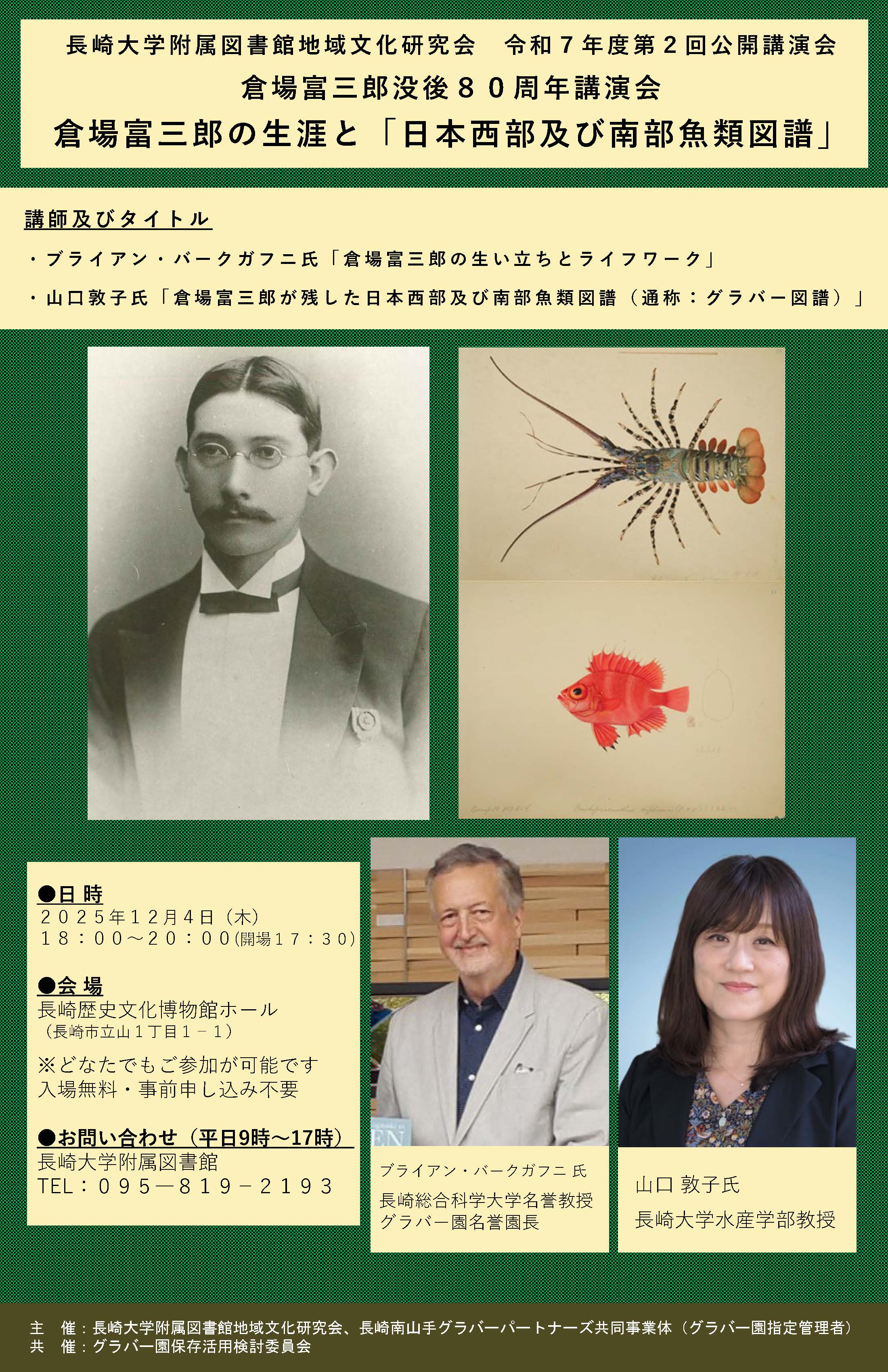 このことを記念し、長年にわたり長崎居留地研究を牽引してきたブライアン・バークガフニ氏、魚類学・水産資源学研究に幅広い視点から取り組んできた水産学部教授の山口敦子氏を講師に迎え、倉場富三郎の生涯とグラバー図譜についてご講演いただきます。
