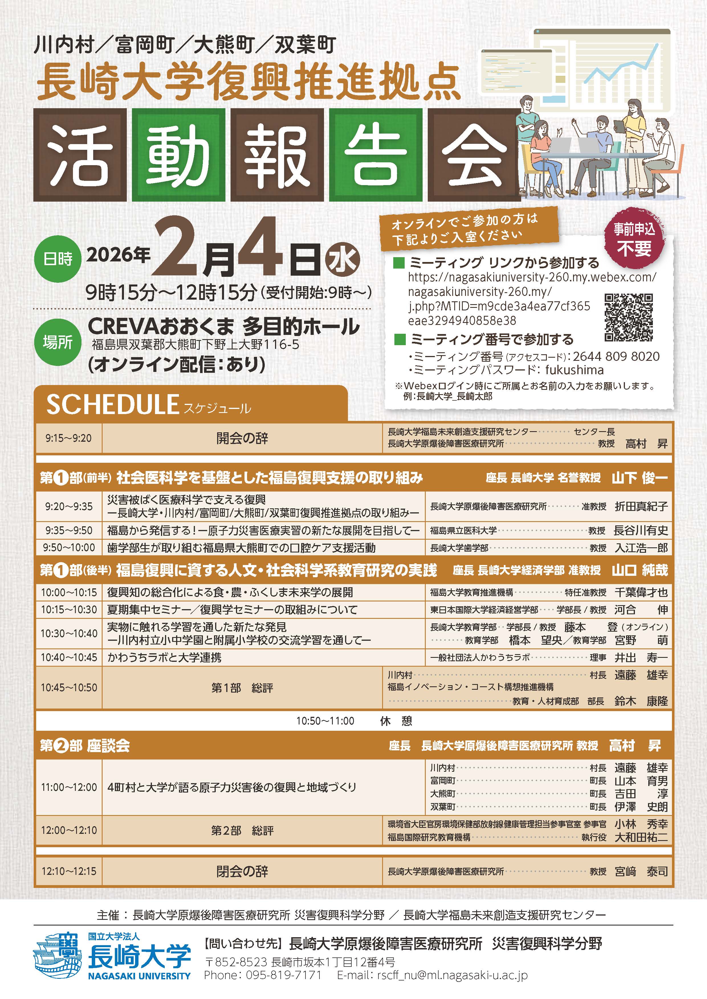東日本大震災および東京電力福島第一原子力発電所事故から、まもなく15年が経過しようとしています。長崎大学は震災直後より復興支援活動を開始し、現在も福島県双葉郡の4町村に拠点を置き、継続的に活動を行ってまいりました。これらの取り組みについては、毎年開催している活動報告会において、その内容や成果を発表しており、今年度は、2月4日(水)に大熊町にて開催することとなりましたので、ご案内いたします。