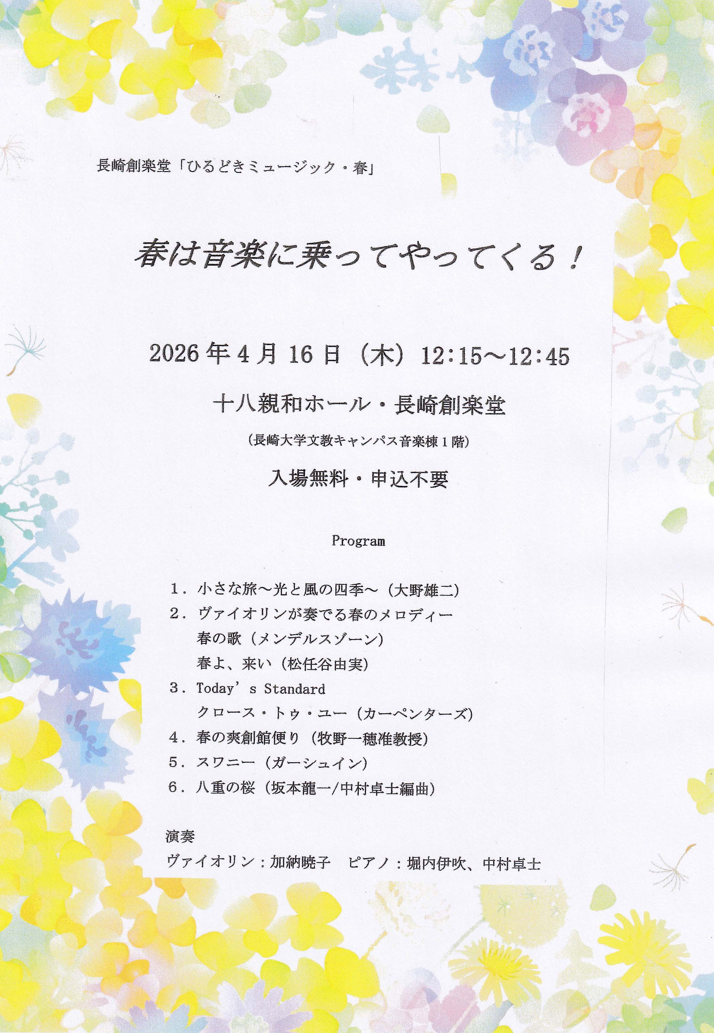 日時: 2026年4月16日(木) 12:15~12:45 場所: 十八親和ホール・長崎創楽堂 (長崎大学文教キャンパス音楽棟1階) プログラム: 添付のチラシをご覧ください。 出演: 加納暁子(ヴァイオリン)、堀内伊吹(ピアノ)、 中村卓士(ピアノ)、牧野一穂(日本画家) 参加費:無料 お問合せ: 長崎大学教育学部(音楽専攻)加納暁子 mail:k-akiko*nagasaki-u.ac.jp ※*を@に置き換えて送信してください。