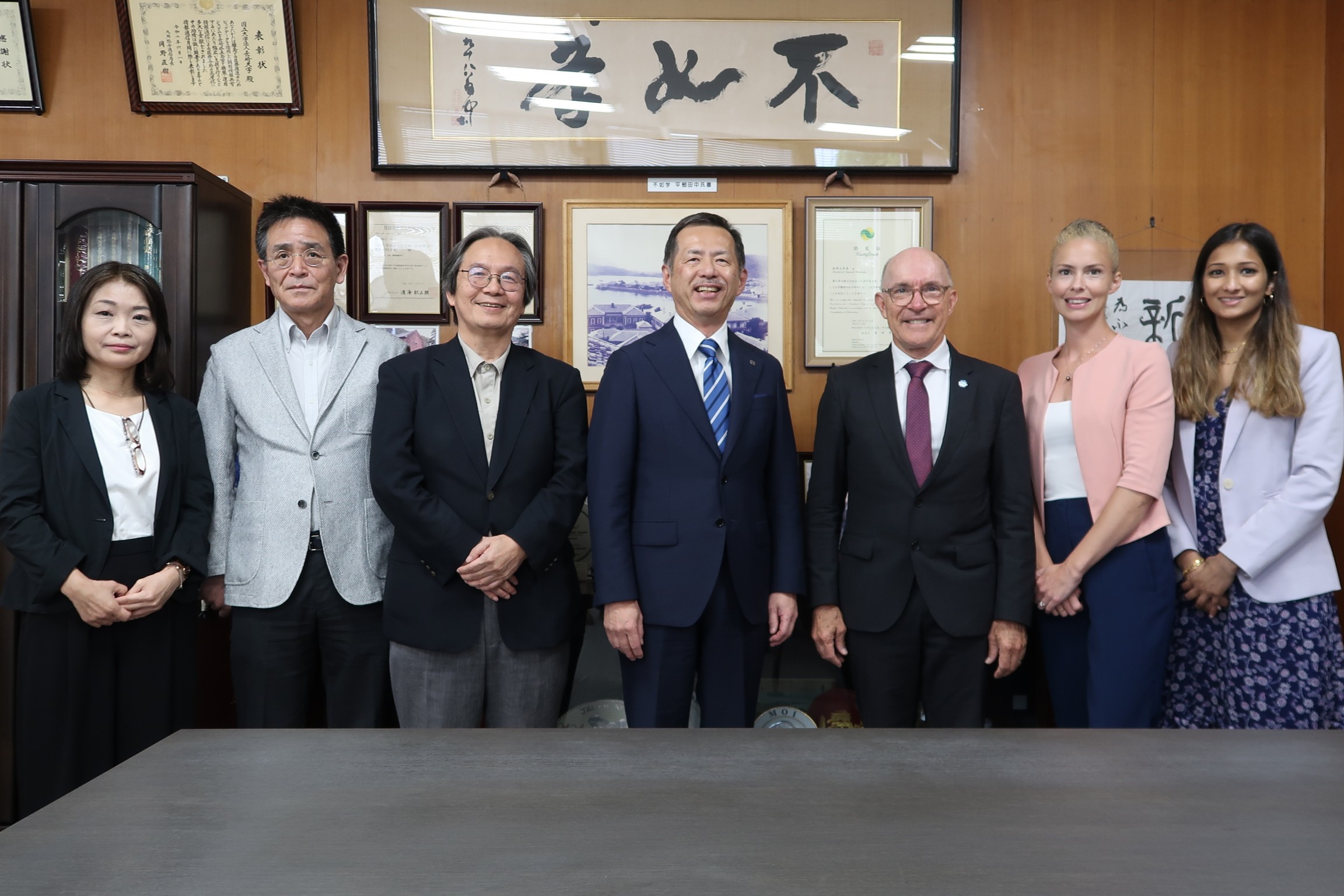 本学からは永安学長をはじめ、核兵器廃絶研究センター(RECNA)センター長の吉田教授、副センター長の樋川教授、多文化社会学部の森川裕二教授らが応対しました。