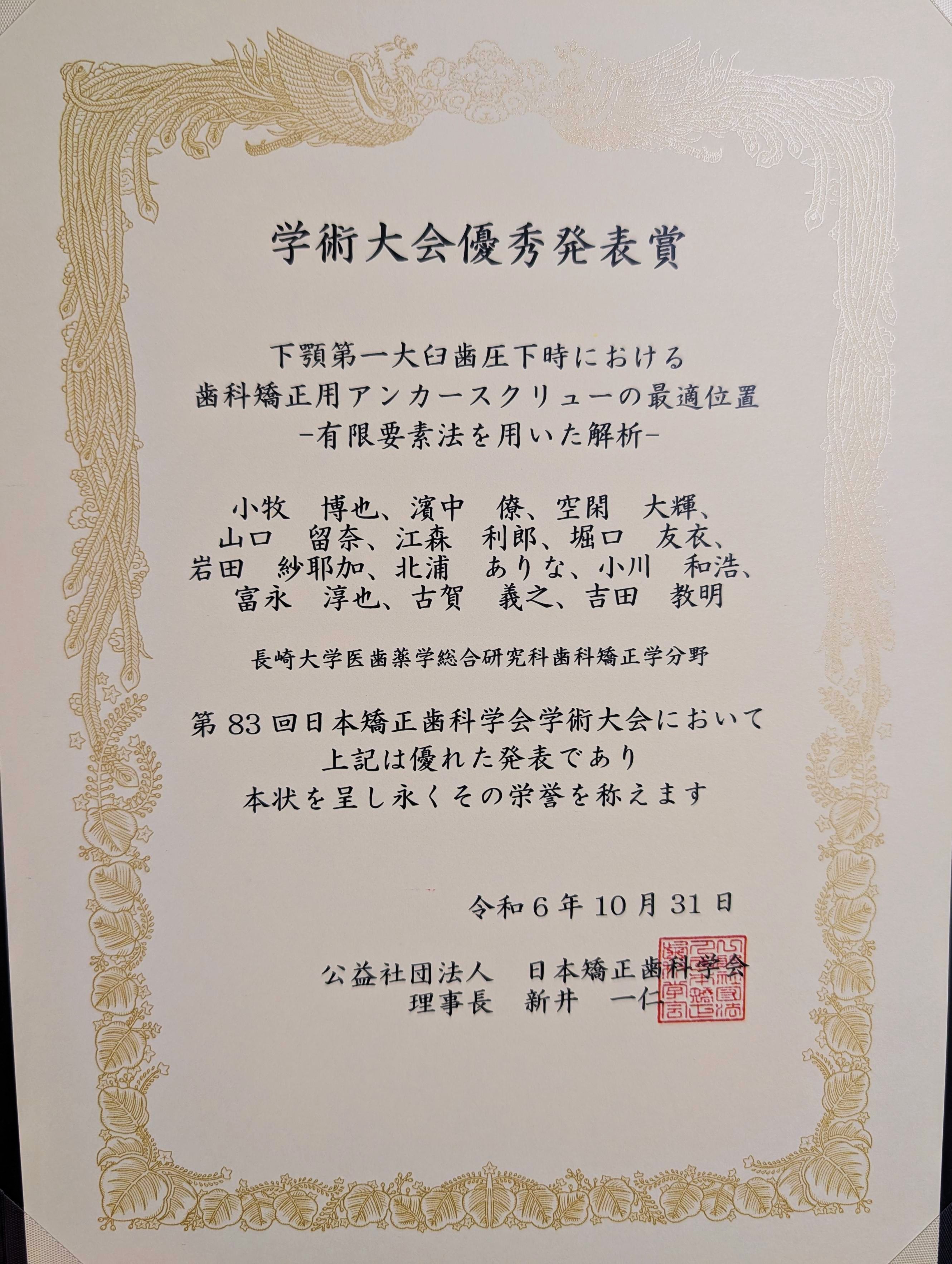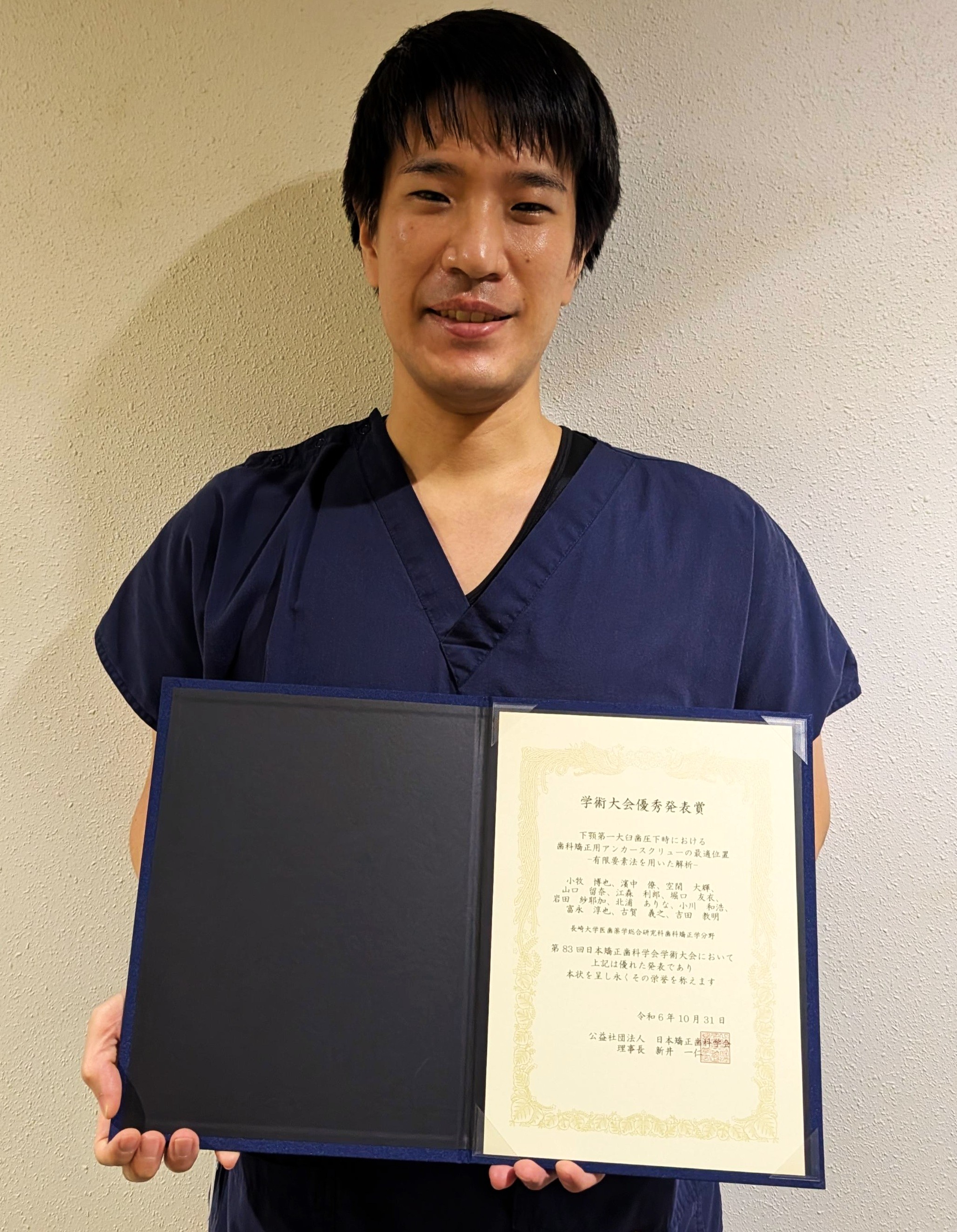 生命医科学域(歯学系)歯科矯正学分野の小牧博也助教が2024年10月29日(火)~31日(木)に横浜で開催された第83回日本矯正歯科学会学術大会において、日本矯正歯科学会学術大会優秀発表賞を受賞しました。演題は「下顎第一大臼歯圧下時における歯科矯正用アンカースクリューの最適位置-有限要素法を用いた解析」です。本賞は、学術展示と症例展示発表のうち、理事長、大会長、学術委員により構成される選考委員会により、特に優れた発表を行った研究者を選出し授与されるものです。