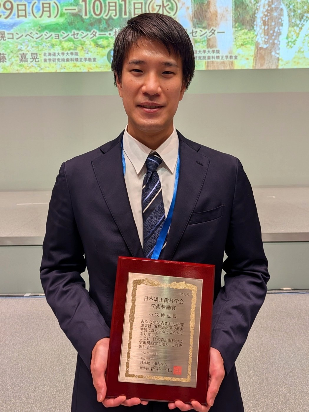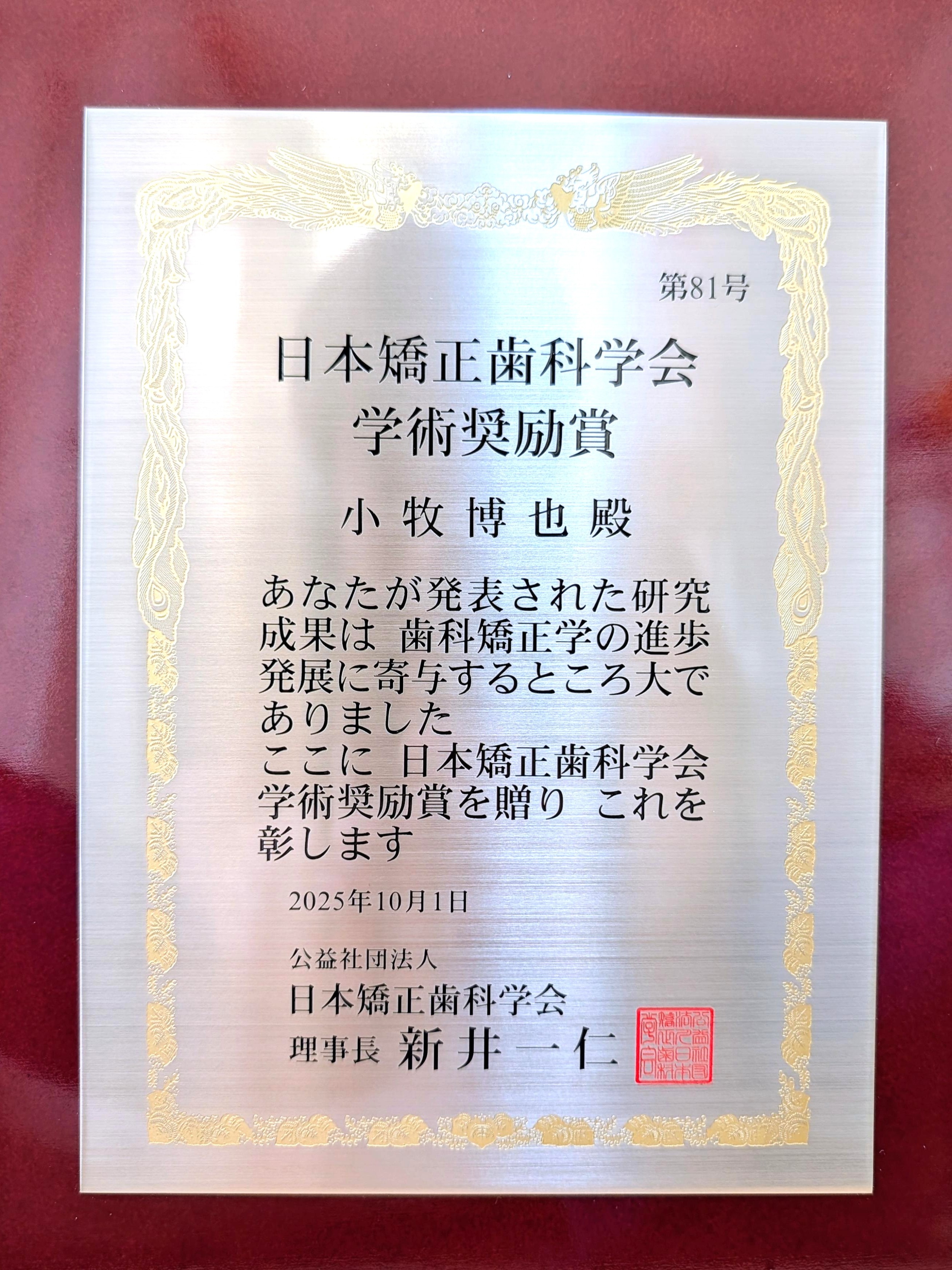 生命医科学域(歯学系)歯科矯正学分野の小牧博也助教が2025年9月29日(月)~10月1日(水)に札幌で開催された第84回日本矯正歯科学会学術大会において、日本矯正歯科学会学術奨励賞を受賞しました。
