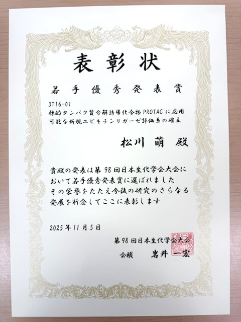 医歯薬学総合研究科生命薬科学専攻博士前期課程2年の松川萌さん(創薬薬理学分野)が、2025年11月3日(月)から5日(水)にかけて国立京都国際会館(京都府京都市)にて開催された第98回日本生化学会大会において、「若手優秀発表賞」を受賞しました。演題は「標的タンパク質分解誘導化合物PROTACに応用可能な新規ユビキチンリガーゼ評価系の確立(松川萌、佐藤伸哉、竹本昌亮、鈴木万葉、中嶋彩希、 松久幸司、岡元拓海、今泉和則、金子雅幸)」です。