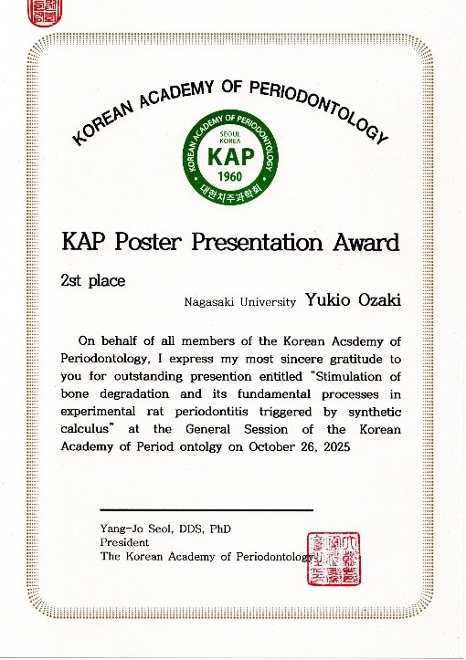 2025年10月25日(土)〜26日(日)に大韓民国ソウル市で開催されたThe 65th General Session of the Korean Academy of Periodontolgyにおいて、生命医科学域(歯学系)歯周歯内治療学分野の尾崎幸生助教がPoster Presentation Awardを受賞しました。