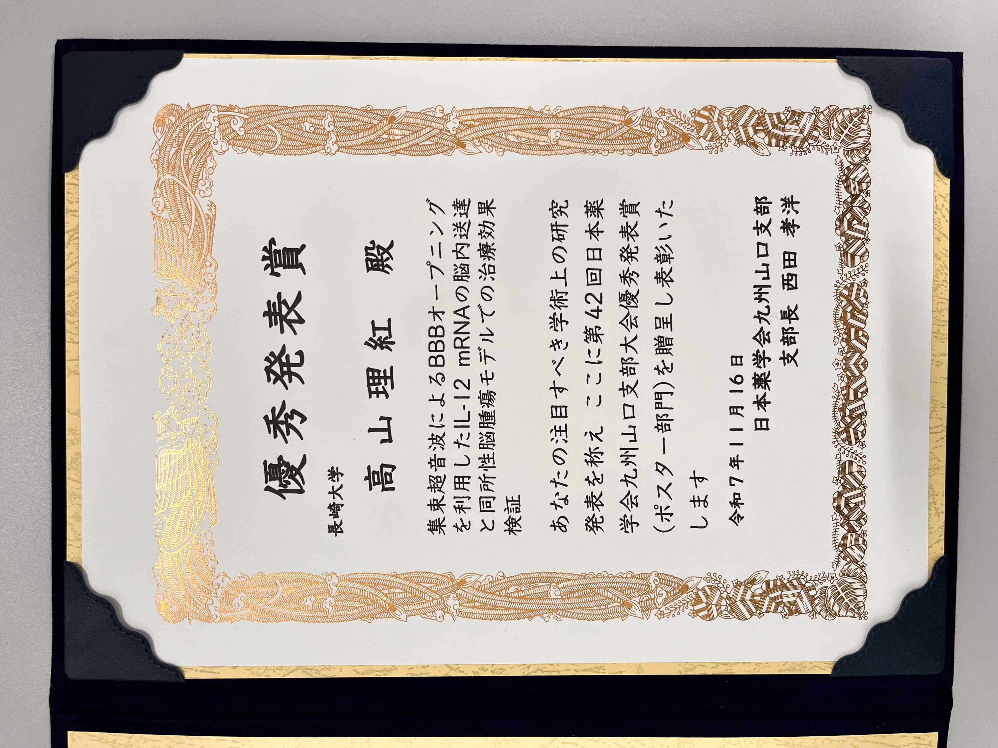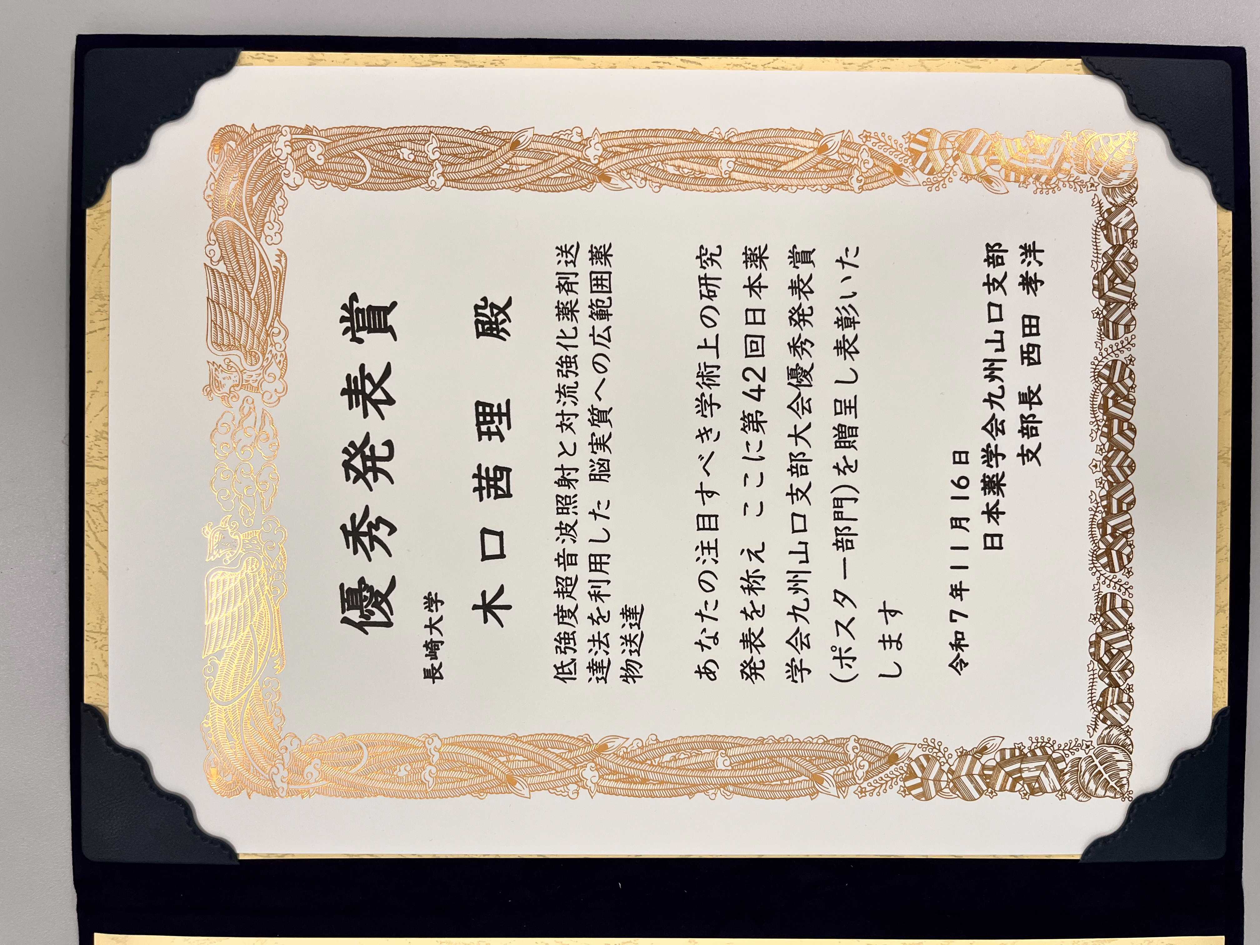 薬学部薬学科6年の高山理紅さん(医薬品情報学分野)と4年の木口茜理さん(医薬品情報学分野)が、2025年11月15日(土)~16日(日)に長崎大学薬学部にて開催された第42回日本薬学会九州山口支部大会において、「優秀発表賞(ポスター発表の部)」を受賞しました。