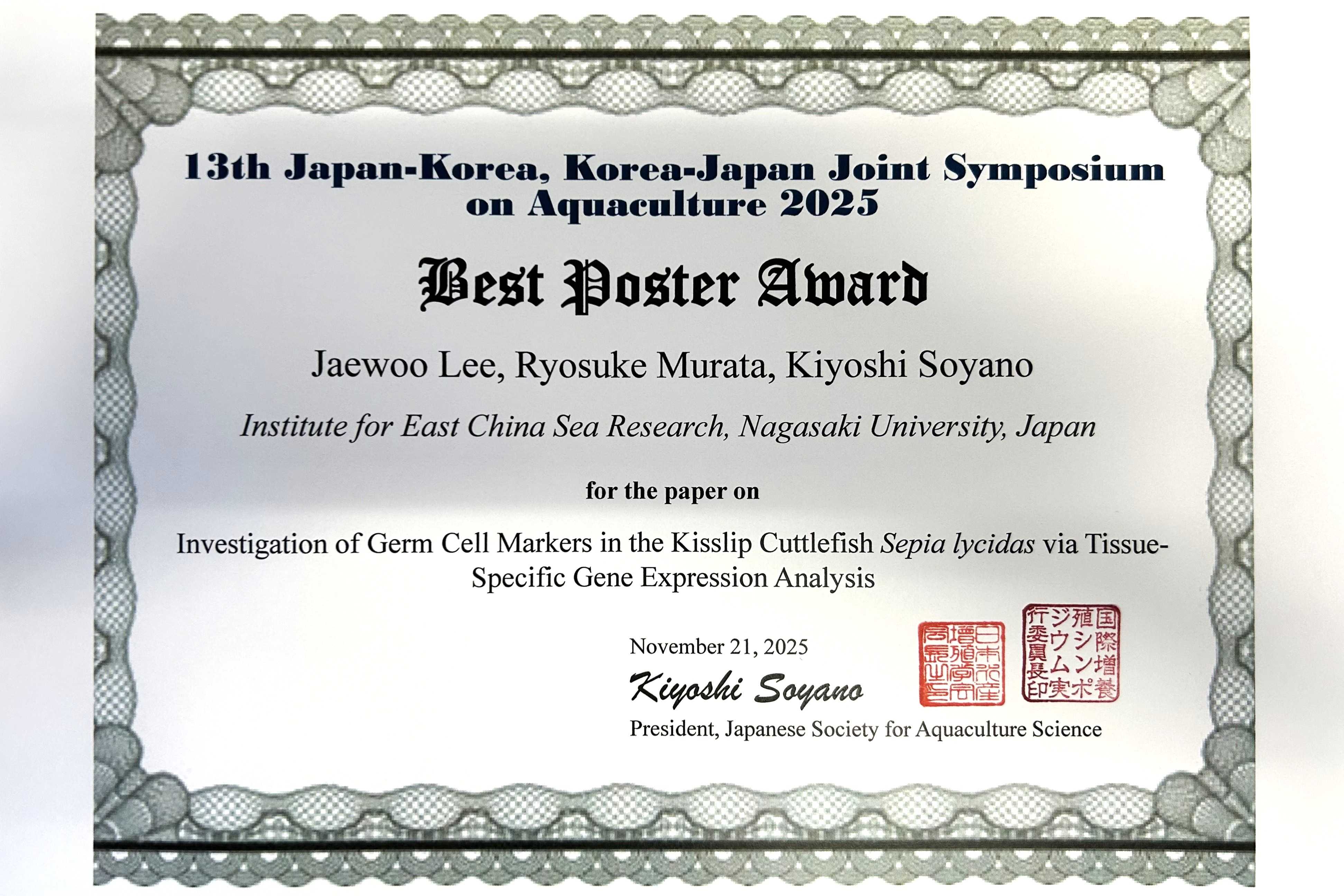 環東シナ海環境資源研究センターに所属する総合生産科学研究科博士後期課程のLEE JAEWOOさん(海洋未来科学コース)が、2025年11月21日(金)、22日(土)にかけて長崎市にて開催された日本水産増殖学会第23回大会および第13回日韓・韓日水産増殖シンポジウムにおいて「ポスター賞」を受賞しました。
