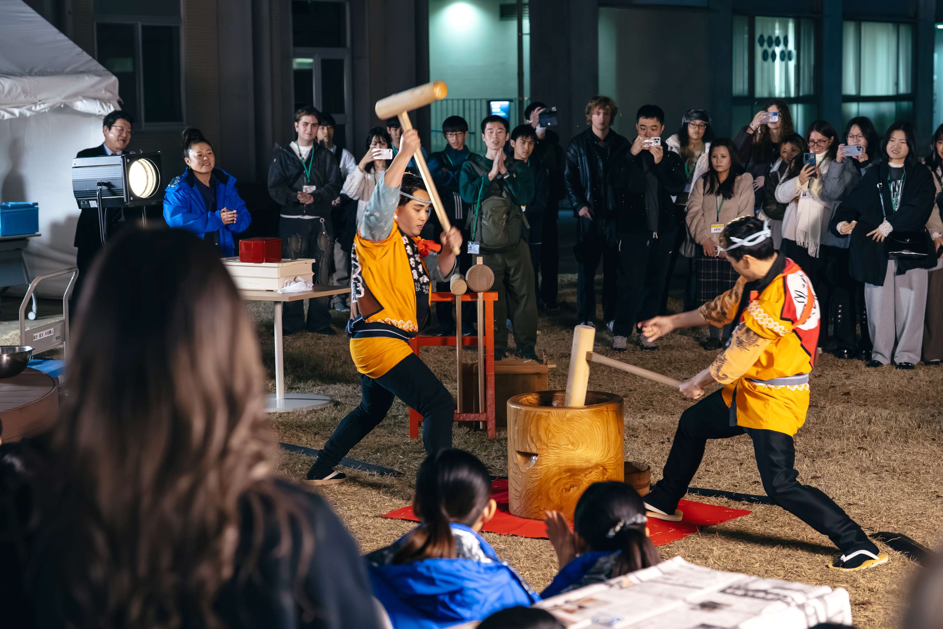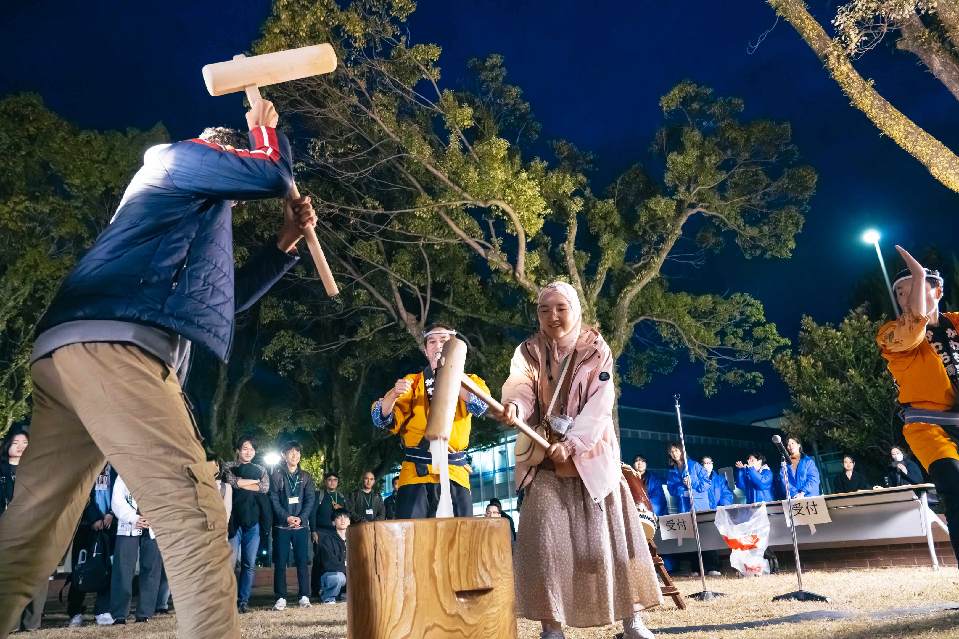 当日は、留学生と日本人学生がともに、餅つきや門松づくり、書初めなど、日本の伝統的なお正月文化を体験しながら交流を深めました。また、竹馬、けん玉、福笑いといった昔ながらの遊びも楽しみ、会場は終始和やかな雰囲気に包まれました。