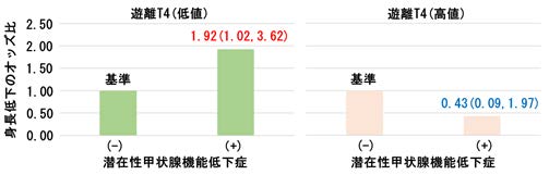 本研究において、遊離T4が正常低値(中央値未満)の者では、潜在性甲状腺機能低下症は統計学的に有意な身長低下リスクであり、遊離T4が正常高値(中央値以上)の者では、潜在性甲状腺機能低下症は統計学的に有意ではないが、身長低下リスクはむしろ低下傾向にあることを認めました。