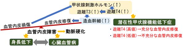 ・先行研究において、甲状腺ホルモンは血管内皮修復に寄与し、血管内皮障害は身長低下リスクであることが報告されています。