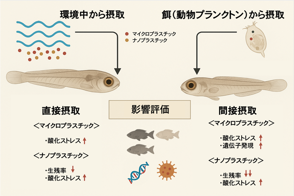 とりわけ重要なのが、魚の初期生活史段階(仔魚)への影響です。仔魚は体サイズが小さく、外部環境の変化に非常に敏感です。さらに、仔魚は動物プランクトンを捕食するため、「餌となるプランクトンが取り込んだプラスチックを、そのまま受け継いでしまう」という食物連鎖特有の曝露経路が存在します。この“餌を介した間接的な摂取”がどの程度危険なのかを把握することは、生態系や漁業資源を考える上で極めて重要な課題ですが、これまでの研究の多くは、プラスチック粒子を水中に直接加えて魚が飲み込む場合(直接摂取)を調べたもので、食物連鎖を介した摂取(間接摂取)との比較はほとんど行われていませんでした。また、ナノスケールの粒子は細胞内に入り込みやすい可能性が指摘されながらも、影響メカニズムの実証研究は極めて限られていました。