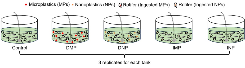 図2. マダイ仔魚の飼育実験の概要図。実験区は5つで、コントロール区(マイクロ・ナノプラスチック無添加)、DMP区(マイクロプラスチックの直接摂取)、DNP区(ナノプラスチックの直接摂取)、IMP区(ワムシを介したマイクロプラスチックの間接摂取)、INP区(ワムシを介したナノプラスチックの間接摂取)で行いました。 |
