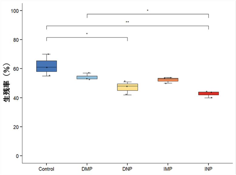 図3. マダイ仔魚の12日間における生存率の箱ひげ図。コントロール区(マイクロ・ナノプラスチック無添加)、DMP区(マイクロプラスチックの直接摂取)、DNP区(ナノプラスチックの直接摂取)、IMP区(ワムシを介したマイクロプラスチックの間接摂取)、INP区(ワムシを介したナノプラスチックの間接摂取)。 |