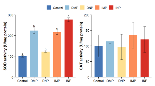図4. マダイ仔魚におけるプラスチック粒子暴露が抗酸化酵素活性に及ぼす影響を示しています。異なる上付きアルファベットは、処理区間で統計的な有意差があることを示します。コントロール区(マイクロ・ナノプラスチック無添加)、DMP区(マイクロプラスチックの直接摂取)、DNP区(ナノプラスチックの直接摂取)、IMP区(ワムシを介したマイクロプラスチックの間接摂取)、INP区(ワムシを介したナノプラスチックの間接摂取)。 |