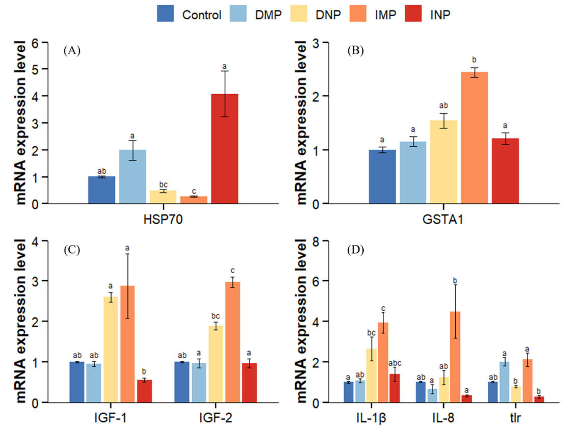 図5. マダイ仔魚におけるプラスチック粒子曝露が相対遺伝子発現に及ぼす影響を示しています。相対遺伝子発現は、(A)環境ストレス、(B)抗酸化応答、(C)成長ホルモン、(D)免疫応答に関連する遺伝子について示しています。異なる上付きアルファベットは、処理区間で有意差があることを示します。コントロール区(マイクロ・ナノプラスチック無添加)、DMP区(マイクロプラスチックの直接摂取)、DNP区(ナノプラスチックの直接摂取)、IMP区(ワムシを介したマイクロプラスチックの間接摂取)、INP区(ワムシを介したナノプラスチックの間接摂取)。 |