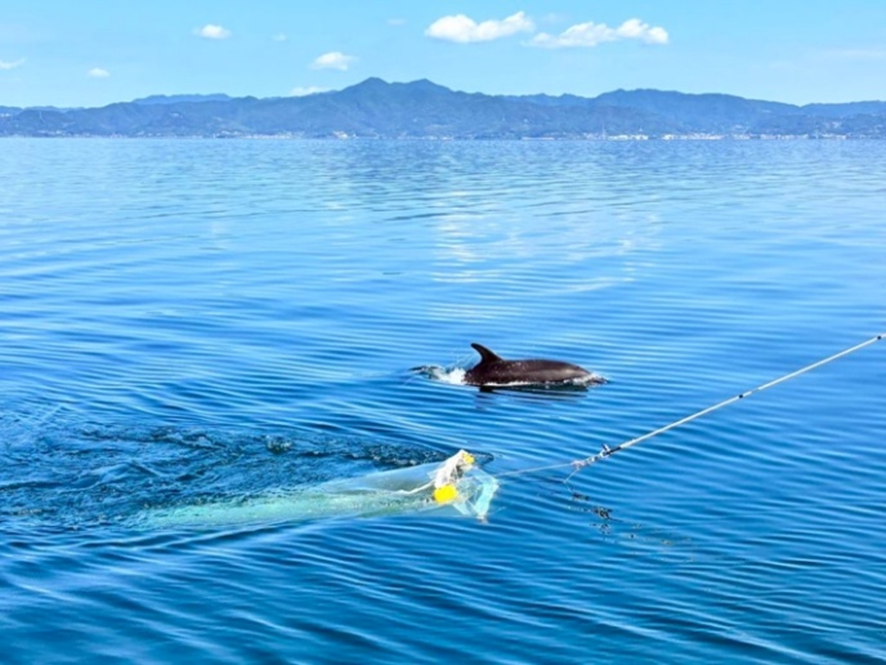 写真2. マイクロプラスチックを捕集するネットに興味を示して並泳するイルカ |