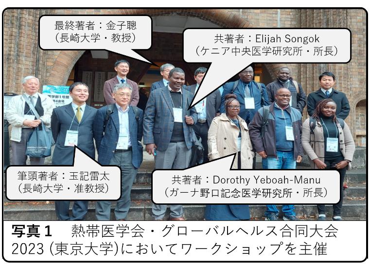 本研究は、長崎大学熱帯医学研究所のケニア拠点を基盤とし、JICAと長崎大学の包括連携協定に基づいてケニアのJICA 技術協力プロジェクト(※)に派遣された玉記准教授が現場で気付いた違和感から始まりました。2023年の熱帯医学会においてケニアやガーナの主要研究所所長(論文共著者)らとの意見交換を重ね(写真1)、2025年のアフリカ開発会議(TICAD9横浜)での発表を経て、国際誌「BMJ Global Health」に掲載されました。