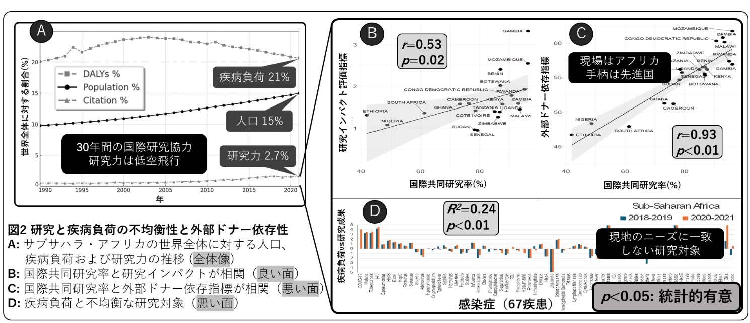 パンデミックリスクのある新興・再興感染症のホットスポットであるサブサハラ・アフリカ(図1)は、世界人口の15%を占め、感染症リスク(疾病負荷)が21%と高いにもかかわらず、研究力はわずか2.7%。様々な外部ドナーの研究投資にも関わらず、30年間にわたり研究力の構造的格差がほとんど改善していないことが明らかになりました(図2A)。