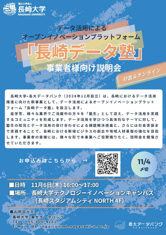 入試情報を知りたい 長崎大学を知りたい 先輩の受験対策、キャンパスライフ卒後の進路 学内トピックス・長崎での生活を知りたい Pick up News すべて 教育・研究 学生活動 社会連携・貢献 受 賞 社会連携・貢献 「週刊あじさい」で情報データ科学部と長崎市の共同実証事業「テクノバながさき」... 2025.10.22 受 賞 医歯薬学総合研究科 歯科補綴学分野の川西祐毅さんが日本歯科理工学会 令和7年度九... 2025.10.22 学生活動 経済学部の学生が西海市のカフェHOGETで共同開発メニューの開発・提供を実施 2025.10.21 社会連携・貢献 長崎で活躍する起業家による講演会を開催しました 2025.10.21 トピックス クラウドファンディングでいただいた支援を基に被爆資料保存の取り組みがスタート 2025.10.20 トピックス ステレンボッシュ大学(南アフリカ)医学部長が長崎大学を訪問 2025.10.20 教育・研究トピックス 地域中核・特色ある研究大学強化促進事業(J-PEAKS)のサイトビジットを開催 2025.09.30 教育・研究 離島で初開催 教育学部「小・中・高校生を対象とした教職セミナー in 新上五島町 ... 2025.09.29 教育・研究 国連大学(UNU)との学術交流協定の調印式を実施 2025.09.19 教育・研究 環境科学部で熊本水俣病問題を考える対話的授業を実施しました 2025.09.08 教育・研究 最先端研究も、研究環境の整備も、若手研究者の育成も 長崎大学 島根大学 大阪公立... 2025.09.01 教育・研究 長崎大学ジュニアドクター育成塾のイベントを開催しました! 2025.08.22 学生活動 経済学部の学生が西海市のカフェHOGETで共同開発メニューの開発・提供を実施 2025.10.21 学生活動 【落語研究会】第17回ちりとてちん杯全国女性落語大会に出場しました 2025.10.08 学生活動 学生の力で地域活性化:ココウォークで果実とアートのコラボイベントを開催 2025.09.30 学生活動社会連携・貢献 ナガサキ・ユース代表団 第14期生が決定 2025.09.30 学生活動 #長大生の日常:大学生の夏休み 2025.09.12 学生活動 日本大学生訪中団2025に19名の学生が参加しました! 2025.09.09 社会連携・貢献 歯学部生による福島県大熊町での口腔ケア支援が行われました 2025.10.08 社会連携・貢献 【公開講座】「長崎の伝統野菜を作ろう~種から考える栽培技術~」第1回の講座を開... 2025.10.01 学生活動社会連携・貢献 ナガサキ・ユース代表団 第14期生が決定 2025.09.30 社会連携・貢献 経済学部生が地域課題に挑戦 花火大会の会場を照らす「茂木提灯ロード」を設置 2025.09.19 社会連携・貢献 第12回 長崎大学海洋未来イノベーション機構(OMST)東京セミナーを開催 ~洋上風... 2025.09.18 教育・研究社会連携・貢献 高校生を対象に「ドローン プログラミング チャレンジ 2025」を開催 2025.08.08 受 賞 医歯薬学総合研究科 歯科補綴学分野の川西祐毅さんが日本歯科理工学会 令和7年度九... 2025.10.22 受 賞 生命医科学域(歯学系)歯科矯正学分野の親川(名城)友香子客員研究員が第84回日... 2025.10.17 受 賞 医歯薬学総合研究科の平山達朗准教授が日本医真菌学会学術賞を受賞 2025.10.14 受 賞 総合生産科学域(環境科学系)の池盛文数准教授が公益財団法人 鉄鋼環境基金 第16... 2025.10.09 受 賞 生命医科学域(歯学系)歯科矯正学分野の小牧博也助教が第84回日本矯正歯科学会学... 2025.10.08 受 賞 長崎大学病院「国境を越えた地域医療支援機構」が平戸市から特別功労賞を受賞 2025.10.07 ニュース一覧 プレスリリース一覧 Admission Events 10月25日(土)~26日(日) どなたでも(小学生以上) ヒミツの海×LABO~きみとまもる海の世界~ 長崎県美術館(長崎市出島町2−1) 10月25日(土) どなたでも 県民公開講座「がんについてよく考えよう」 ベネックス長崎ブリックホール国際会議場(長崎市茂里町2−38) 10月29日(水) 環境科学部に関心のある方、入学を考えている方 環境科学部オンライン説明会 オンライン配信(Teams) 4月1日(火)~10月31日(金) どなたでも 長崎大学経済学部創立120周年記念展 片淵キャンパス 附属図書館経済学部分館 展示室 11月1日(土)~2日(日) どなたでも F-REI国際シンポジウム Jヴィレッジ(福島県双葉郡)/オンライン 11月1日(土) どなたでも 県民公開講座「みて、きいて、健康チェック!脳卒中と心臓病」 出島メッセ長崎(長崎市尾上町4-1) 11月2日(日) どなたでも わくわく!なるほど!海の生き物✕サイエンス!「第20回ながさき水産科学フェア」 ⻑崎市多以良町 1551 11月2日(日) どなたでも 県民公開講座「自殺予防講演会」精神科医と考える あなたにもできる身近な人の支え方 坂本キャンパス 医学部良順会館 11月6日(木) 自治体・企業など事業者の皆様 「長崎データ塾」事業者様向け説明会 長崎スタジアムシティ ノース棟4F NUTIC(長崎市幸町7-1) 11月13日(木) どなたでも 多文化社会学研究科オンライン進学説明会 オンライン配信(Zoomウェビナー) 11月14日(金) どなたでも 「難病疾患の緩和ケアについて」荻野美恵子教授 講演会 長崎大学病院 第4講義室/オンライン(Teams) 11月15日(土) どなたでも 「移民・難民の受け入れについて考える」 日本橋ライフサイエンスビルディング(東京都中央区日本橋本町2-3-11) 10月25