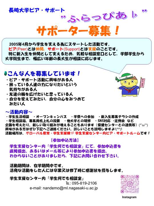 主に学生生活の相談など本学の学生が学生の質問・相談等を聞き、アドバイスしたり、