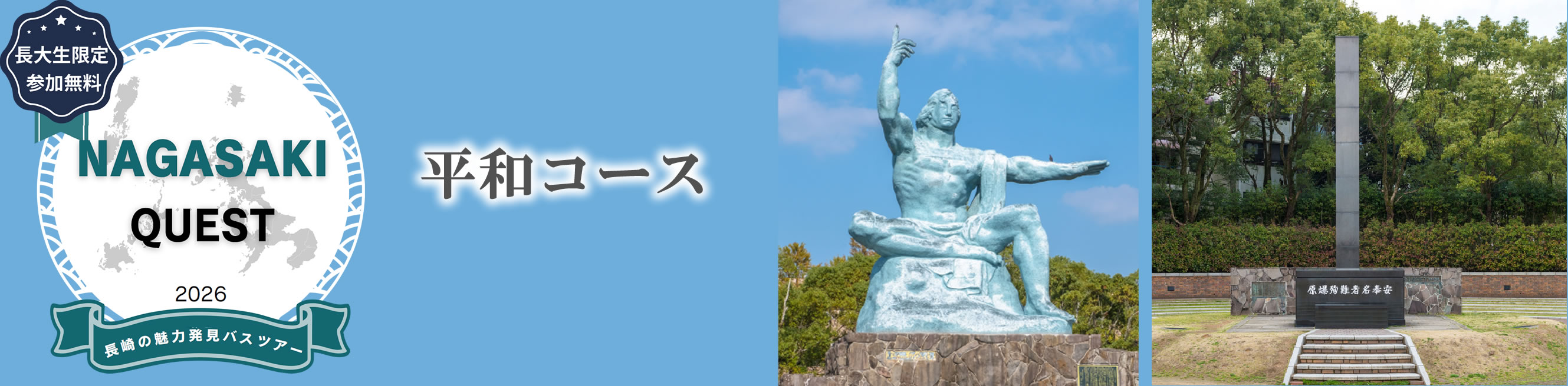 長崎大学を出発し、平和公園や原爆資料館、浦上天主堂などを巡る日帰りバスツアーです。被爆の記憶をたどりながら、平和の尊さと命の重みを学びます。昼食はココウォークで自由に楽しめるクーポン付き。歴史を肌で感じ、未来へつなぐ学びの旅へ、ぜひご参加ください。