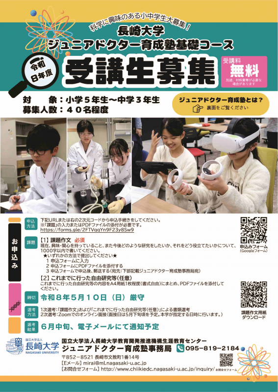 令和8年度 長崎大学ジュニアドクター育成塾 基礎コース受講生募集