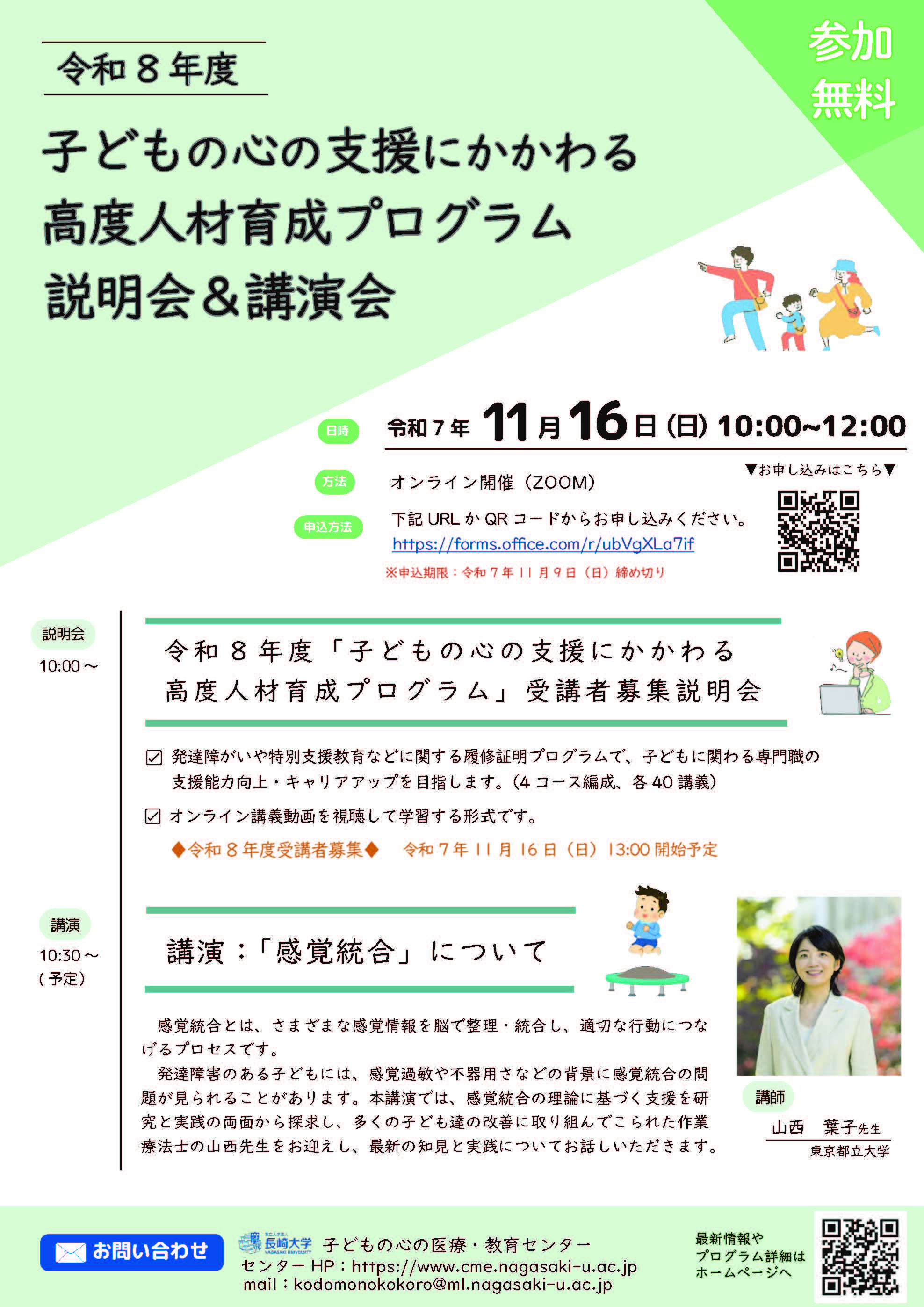 長崎大学子どもの心の医療・教育センターでは、子どもの心の支援にかかわる高度人材育成プログラム説明会および講演会を開催します。どなたでも参加可能です。ぜひご参加ください。
