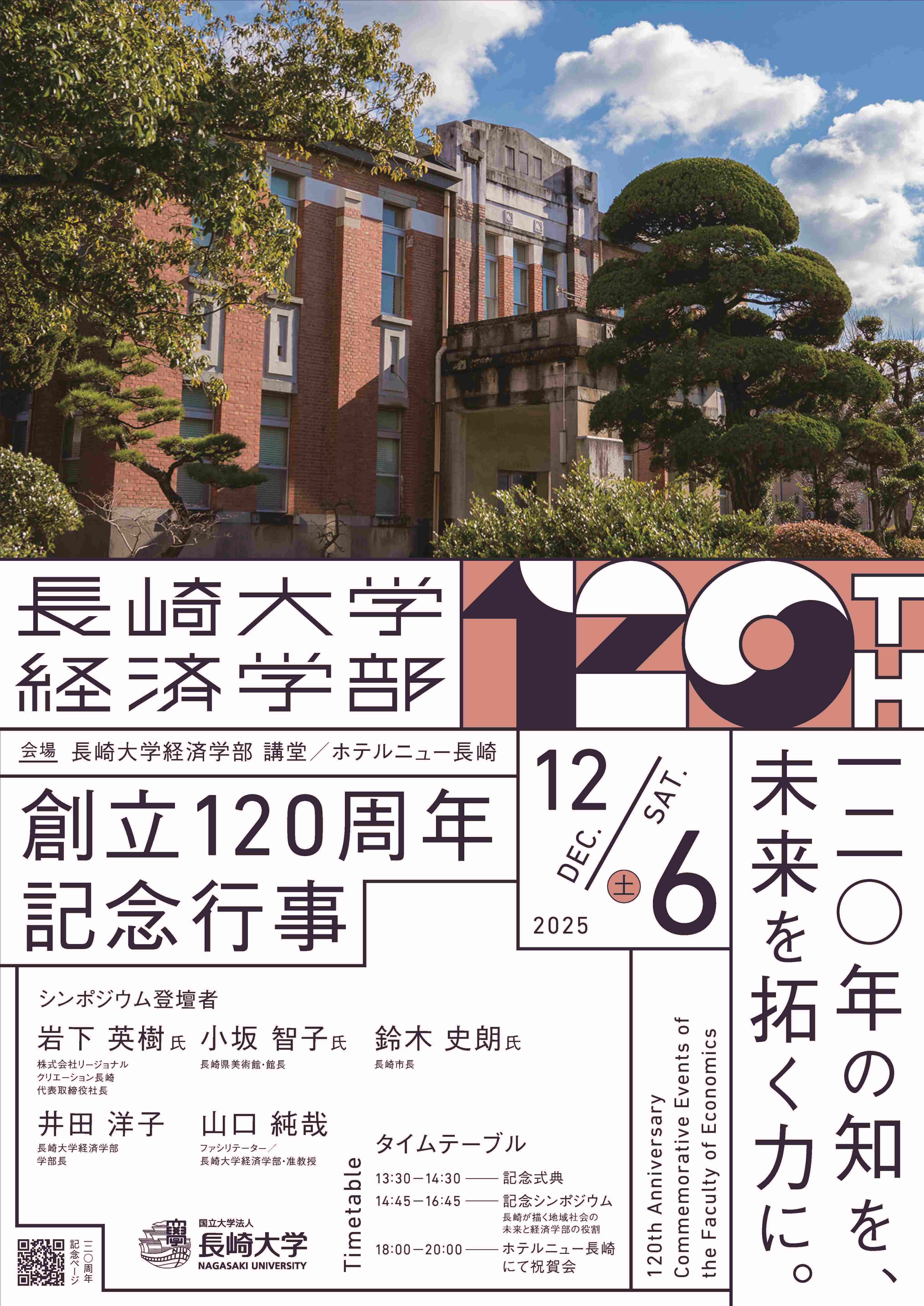 日時: 令和7年12月6日(土) 記念式典 13:30~14:30 記念シンポジウム 14:45~16:45 場所: 長崎大学経済学部講堂(式典及びシンポジウム) (長崎市片淵4丁目2番1号) 申込締切:10月31日(金) 長崎大学経済学部創立120周年記念ページはこちら https://www120th.econ.nagasaki-u.ac.jp/ 参加申込ページはこちら https://www120th.econ.nagasaki-u.ac.jp/topics/474/ |
