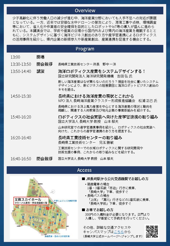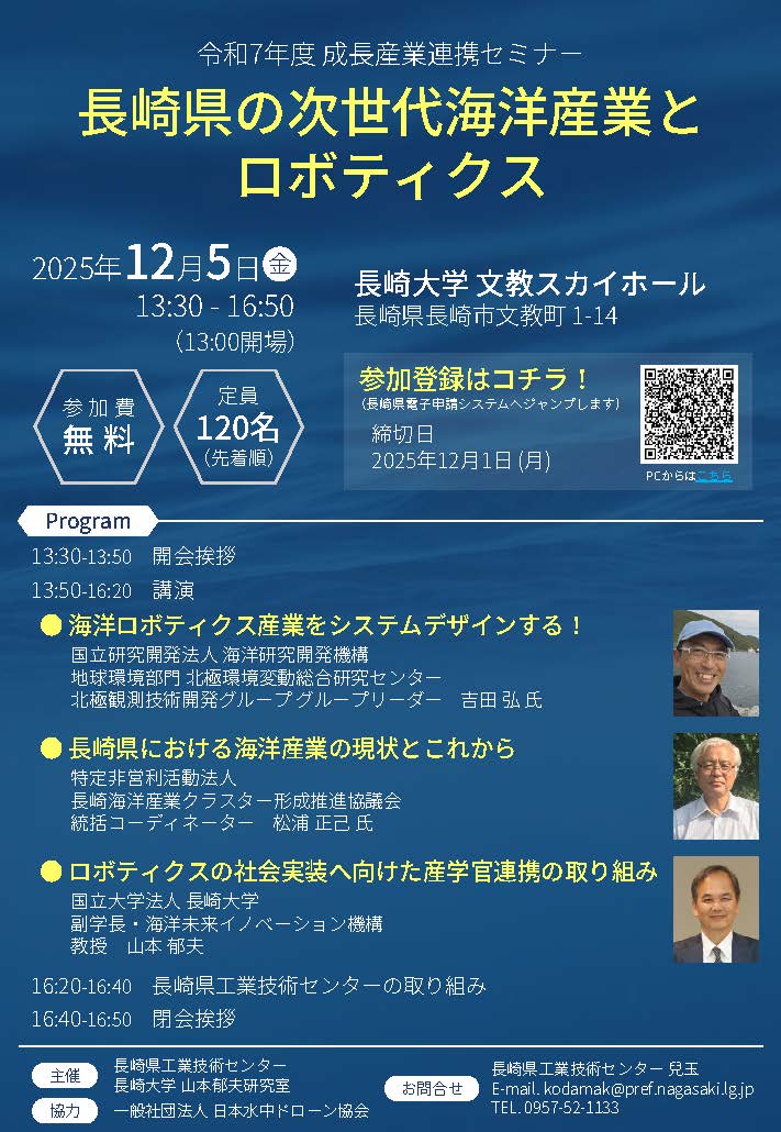 長崎県工業技術センターおよび国立大学法人長崎大学(山本郁夫研究室)では、県内の海洋関連分野における新産業創出と企業間連携の促進を目的として、2025年12月5日(金)に令和7 年度成長産業連携セミナー「長崎県の次世代海洋産業とロボティクス」を開催します。本セミナーでは、海洋ロボティクスや産学官連携による社会実装の最新事例を紹介し、長崎県における次世代海洋産業の発展に向けた具体的な方向性を議論します。