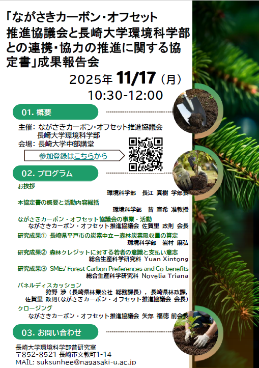 環境科学部は、ながさきカーボン・オフセット推進協議会との連携協定に基づく取組の成果を広く共有するため、「ながさきカーボン・オフセット推進協議会と環境科学部との連携・協力の推進に関する協定書」成果報告シンポジウムを開催します。