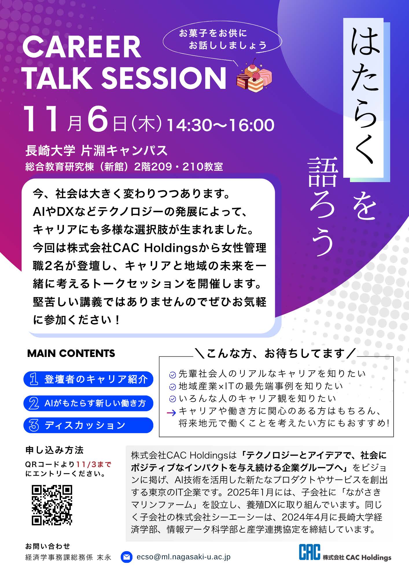 | 日時: 2025年11月6日(木) 14:30~16:00 場所: 長崎大学 片淵キャンパス 総合教育研究棟(新館) 2階209・210講義室 対象: 長崎大学の学生 主なプログラム: ・株式会社CAC Holdings女性管理職による キャリア紹介 ・話題提供:DXがもたらす働き方改革事例 ・グループディスカッション:目指す働き方と 「長崎で働く未来」 ・長崎大学教授から地域活性化についての メッセージ 申込: 添付の二次元コードまたはこちらをご確認ください。 ※申込締切を延長しております! |