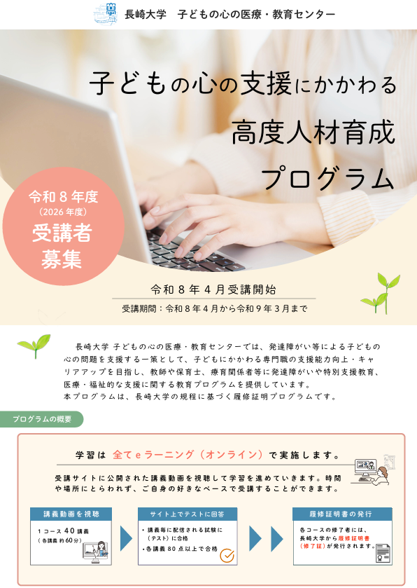 子どもの心の医療・教育センターでは、発達障がい等による子どもの心の問題を支援する一策として、「子どもの心の支援にかかわる高度人材育成プログラム」を実施しております。発達障がいや特別支援教育に関するオンラインの履修証明プログラムです。2018年からスタートし、長崎県内外から多数の方にご受講いただいております。令和8年度につきましても、以下の要項で受講者を募集いたします。