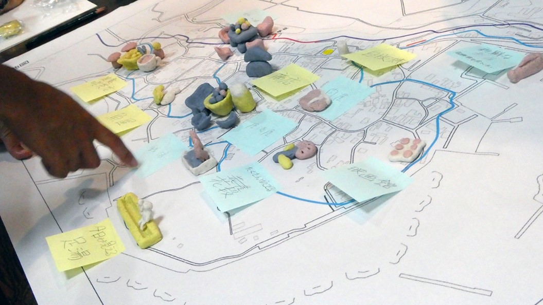 ワークショップでは、残野菜を原料に製造され、使用後は土に還る「みんなの粘土」を使い、地域の将来に欲しい、もしくは必要だと考える「こと」や「もの」を参加者それぞれが造形しました。その後、それらを大浜地区の地図に配置し、地域社会の将来について子どもと大人が一緒に話し合いました。子どもたちからは、映画館や文房具店など、大人からは足湯やコインランドリー、飲食店などが欲しいとの声が聞こえてきました。