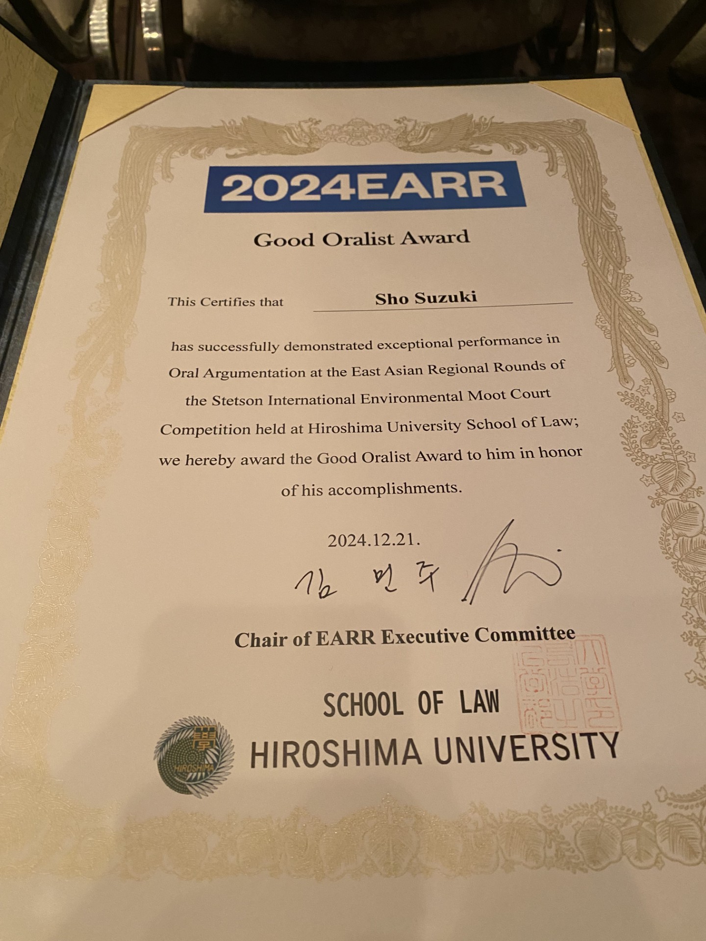 多文化社会学部4年生の鈴木翔さんが2024年12月18日から21日にかけて、広島大学法学部で開催された第29回ステットソン国際環境法模擬裁判大会東アジア地区ラウンド(The East Asia Regional Rounds, 29th Annual Stetoson International Environmental Moot Court Competition)において、個人賞のGood Oralist Awardを受賞しました。