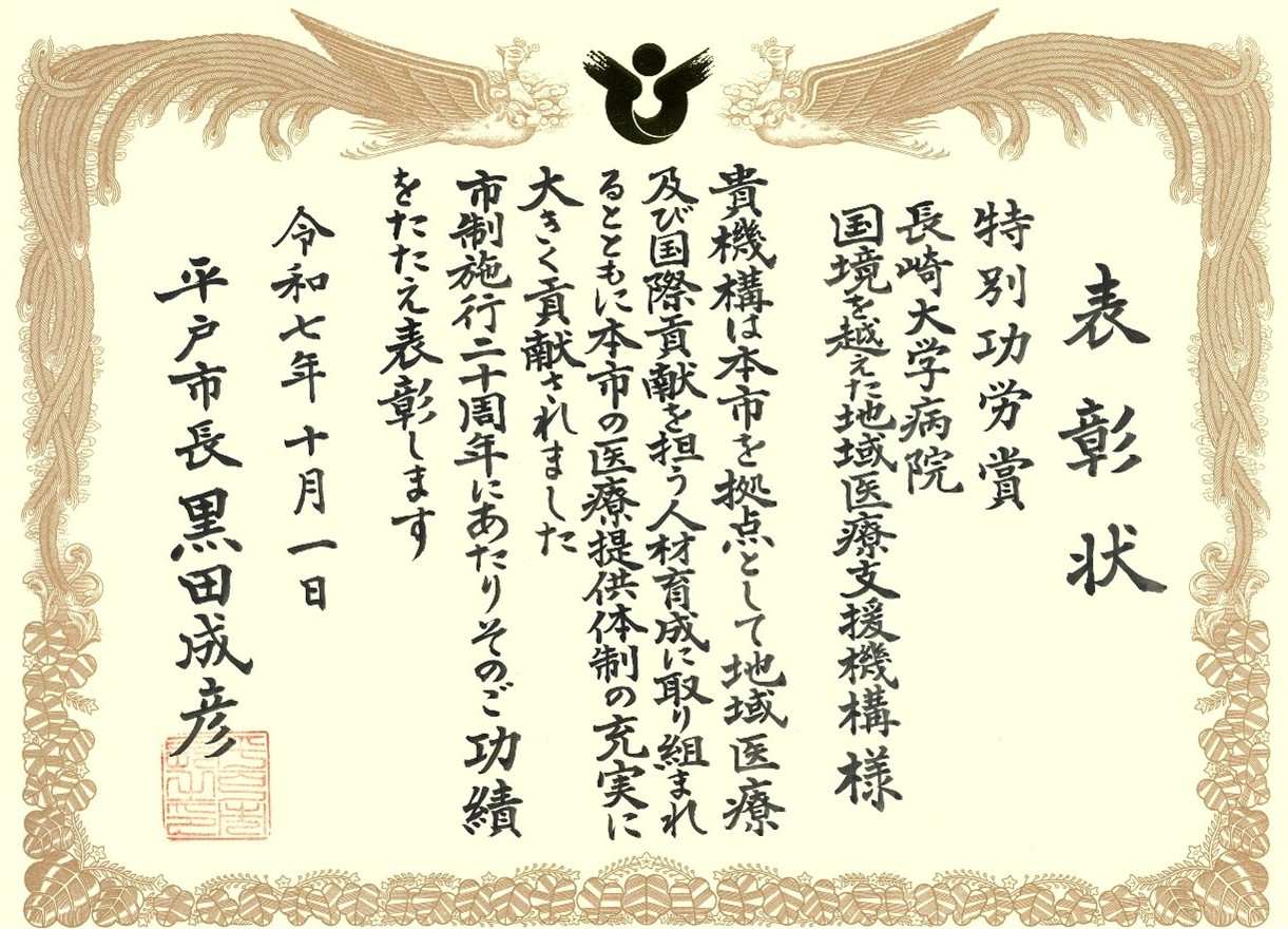 2025年10月1日(水)、平戸文化センターで開催された平戸市市制施行20周年記念式典において、長崎大学病院「国境を越えた地域医療支援機構」が特別功労賞を受賞しました。
