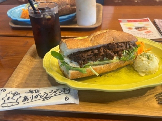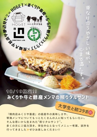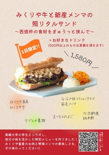 2025年10月19日(日) に経済学部 辺見英貴研究室の学生が、CAFE HOGET (西海市西海町) で共同開発メニューの提供を行いました。本ゼミ生が、ミクリヤ畜産(西海市西海町)が生産する和牛と、G・G戸根アクションクラブ(長崎市琴海戸根町)が生産するメンマを用いた「牛タルサンド」を開発しました。