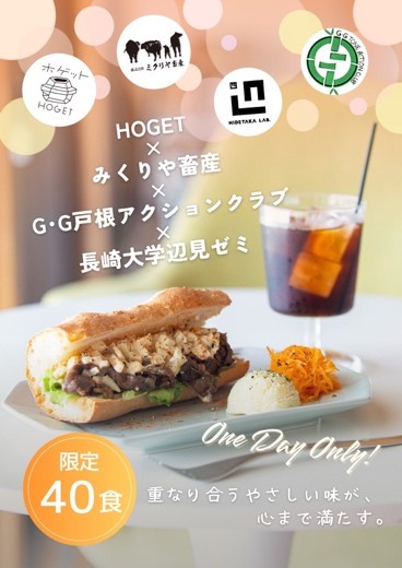 本ゼミでは、ミクリヤ畜産の課題である和牛の販売促進と、G・G戸根アクションクラブの課題である高齢者就労支援および自然資源活用を解決するために、フィールドワークを通して事業者や地域の課題の理解と解決に向けた活動をしています。今回はその活動の1つとして、西海市のカフェHOGETとともに、学生が1から地元地域の食材を活かしたメニュー開発をおこない、販売当日は接客、調理、提供を実施しました。
