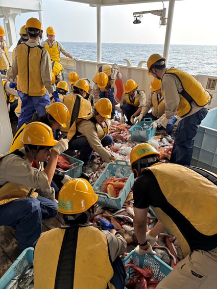 2025年10月17日(金)に長崎港を出港、講義やトロール実習、操船実習などの後、19日(日)に釜山港に入港しました。釜山市では20日(月)に釜慶大学校を訪問し、釜慶大学校の大学院生の皆さんとともに英語で学術講演会を開催しました。21日(火)には魚市場の見学などを行いました。そして22日(水)に釜山港を出港、実習を継続しながら23日(木)に長崎港に戻りました。参加した大学院生は英語によるプレゼンテーション・コミュニケーション能力を涵養し、船の生活を満喫しました。