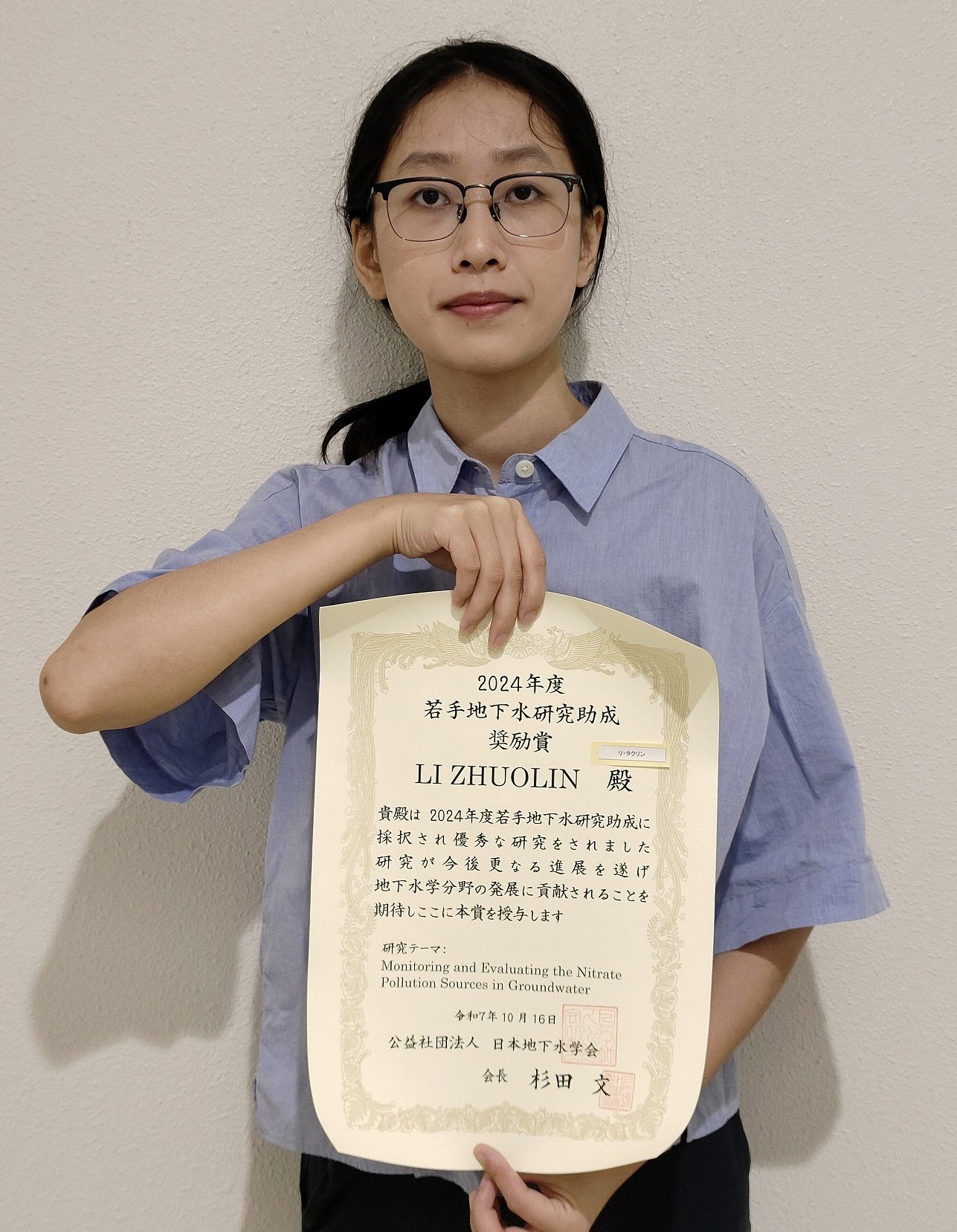 総合生産科学研究科 共生システム科学コース 博士後期課程2年(環境地下水学研究室)の李卓霖さんが、2025年10月16日(木)に岐阜県大垣市で開催された日本地下水学会秋季講演会において、日本地下水学会若手地下水研究助成賞を受賞しました。受賞対象となった研究内容は、2024年度若手地下水研究助成に採択され、実施してきた「Monitoring and Evaluating the Nitrate Pollution Sources in Groundwater」と題するもので、このたびこの研究成果が高く評価され、受賞に至ったものです。