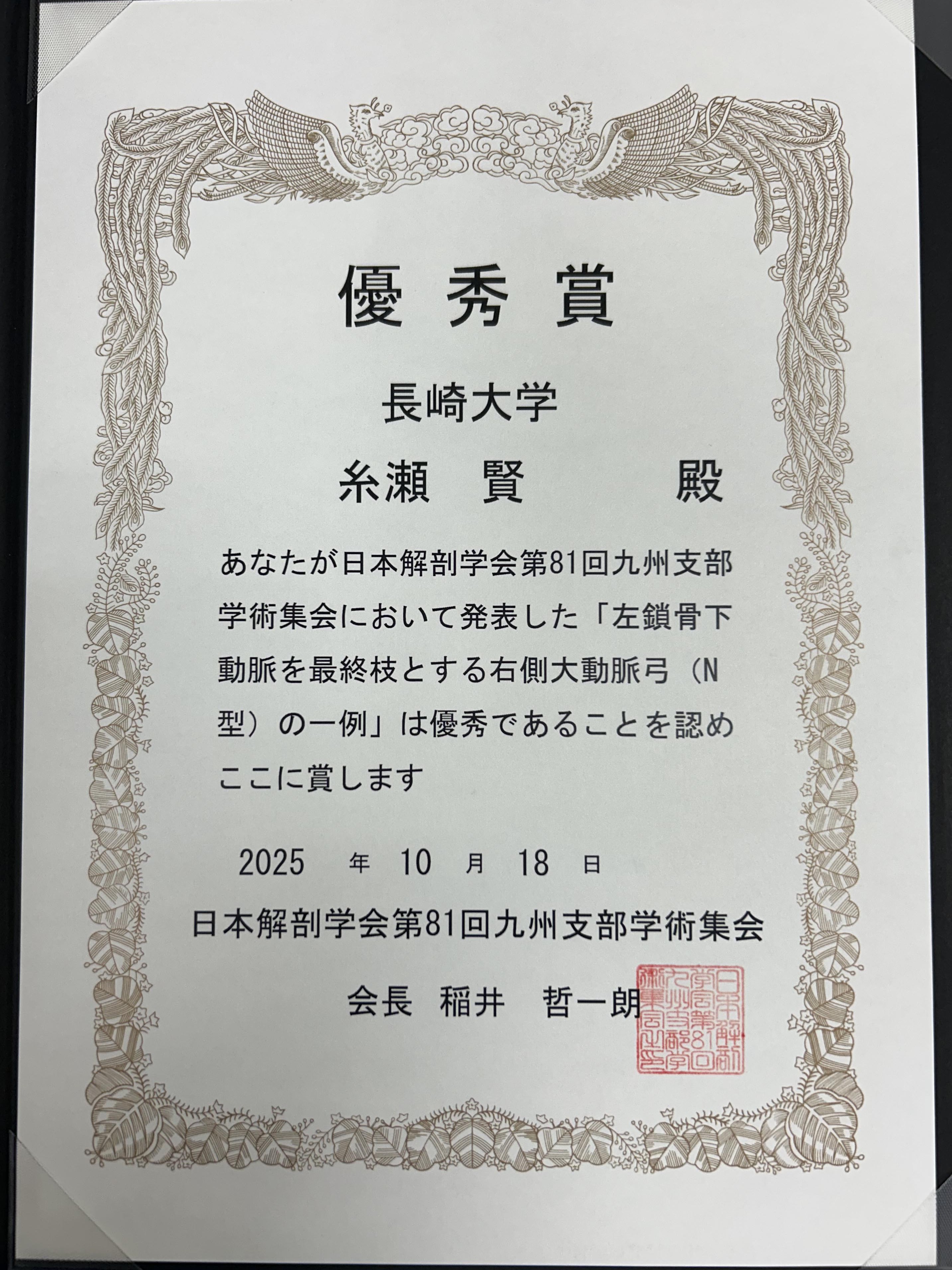 医歯薬学総合研究科 医療科学専攻 肉眼解剖学分野1年の糸瀬賢さんが、2025年10月18日(土)に開催された日本解剖学会第81回九州支部学術集会の一般講演において「優秀賞」を受賞しました。