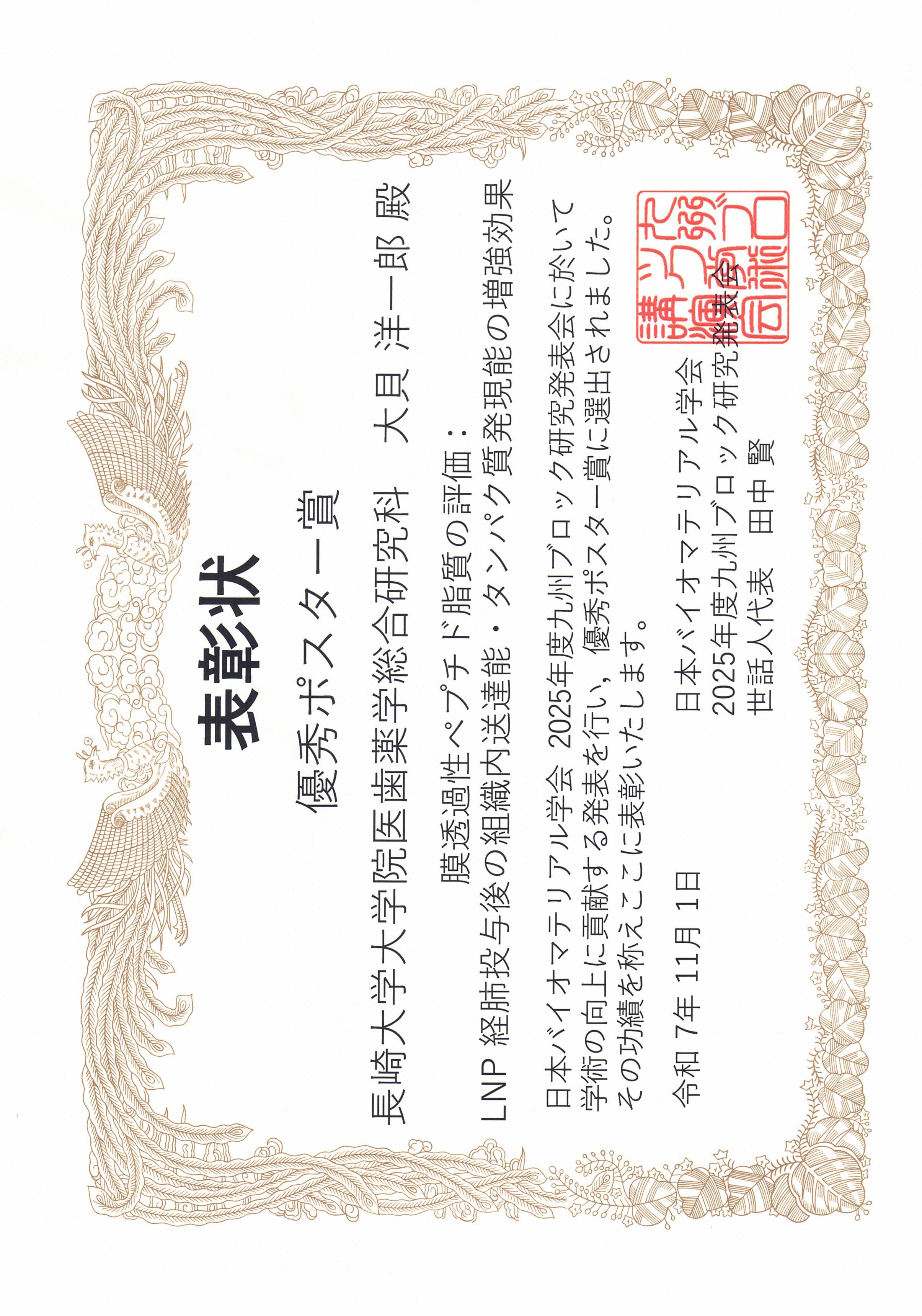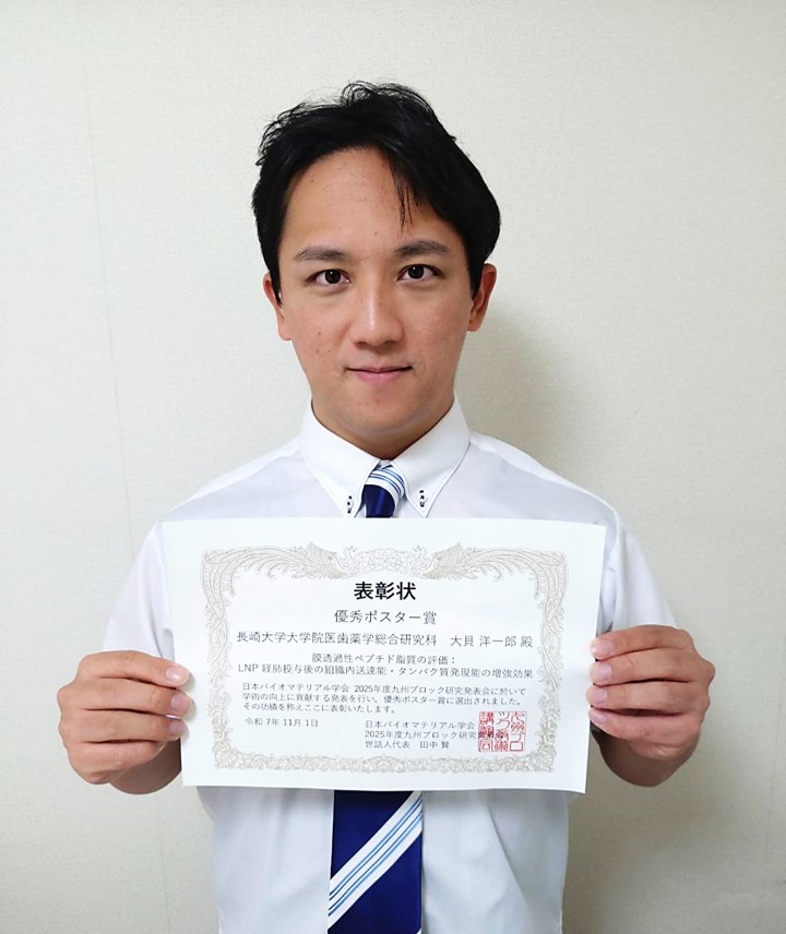 医歯薬学総合研究科 医療科学専攻 博士課程3年の大貝洋一郎さん(医薬品情報学分野)が、2025年11月1日(土)に本学で開催された「日本バイオマテリアル学会2025年度九州ブロック研究発表会」において、優秀ポスター賞を受賞しました。
