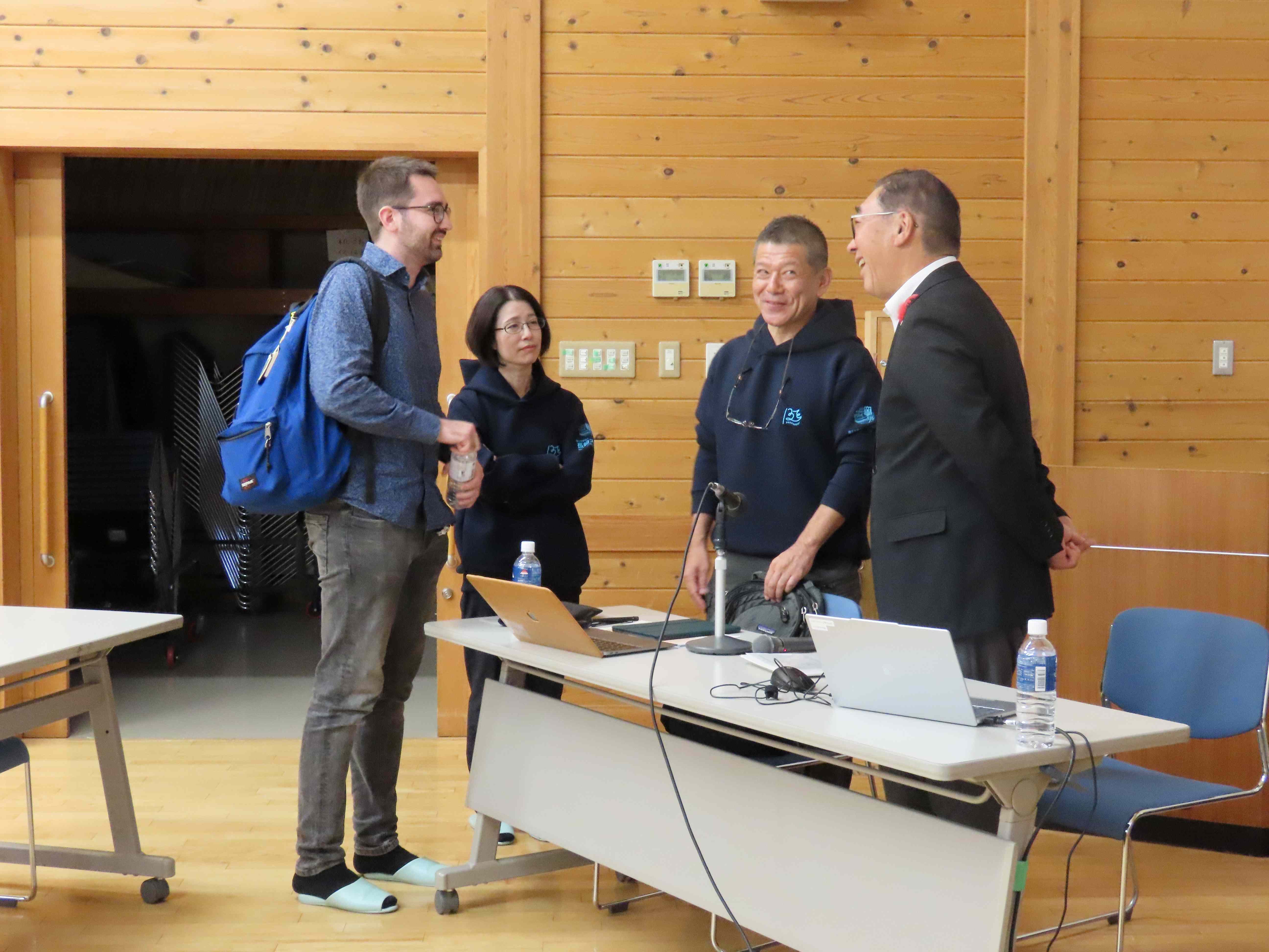 左から リアムさん、折田准教授、高橋助教、川内村遠藤村長 |