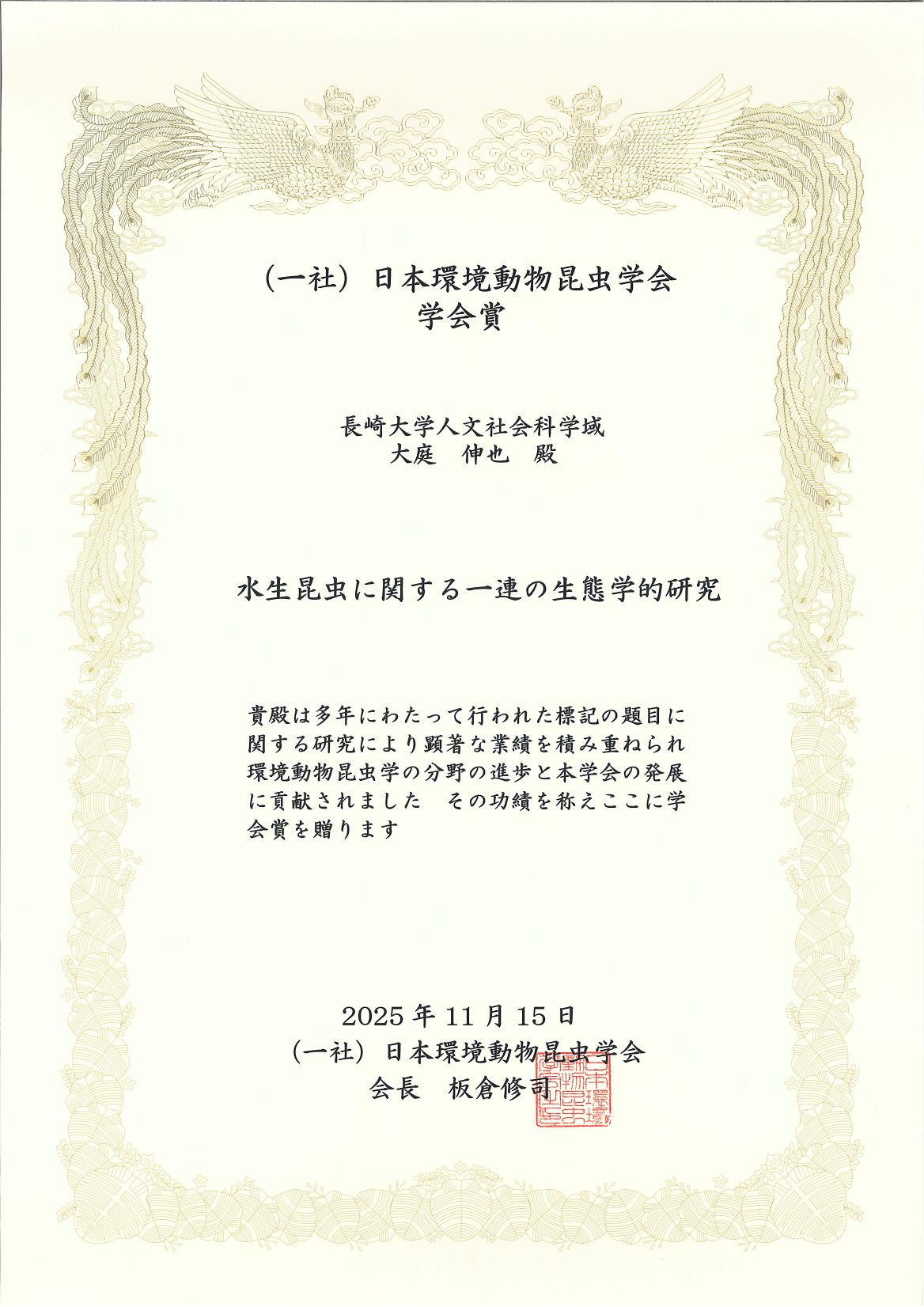 教育学部の大庭伸也准教授が、2025年11月15日(土)~16日(日)に文教キャンパスで開催された第37回日本環境動物昆虫学会年次大会において、学会賞を受賞しました。この賞は、長年にわたる研究活動を通じて顕著な業績を挙げ、環境動物昆虫学の分野の進歩と学会の発展に大きく貢献した研究者に贈られるものです。受賞式および受賞講演は大会初日に行われました。
