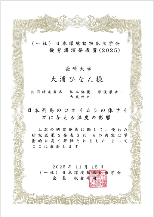 総合生産科学研究科博士前期課程2年の大浦ひなたさんが、2025年11月15日(土)~16日(日)に文教キャンパスで開催された第37回日本環境動物昆虫学会年次大会において、「優秀講演発表賞」を受賞しました。受賞式は大会初日に行われました。