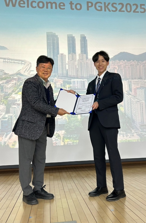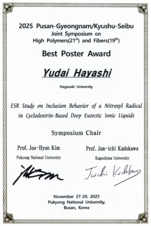 総合生産科学研究科総合生産科学専攻共生システム科学コース化学・物質科学分野 修士2年の林 雄大さんが、2025年11月27日(木)~29日(土)に釜慶大学で開催された 2025 Pusan-Gyeongnam/Kyushu-Seibu Joint Symposium on High Polymers (21st) and Fibers (19th) (PGKS 2025)において、「Best Poster Award」を受賞しました。