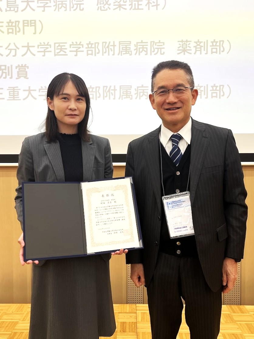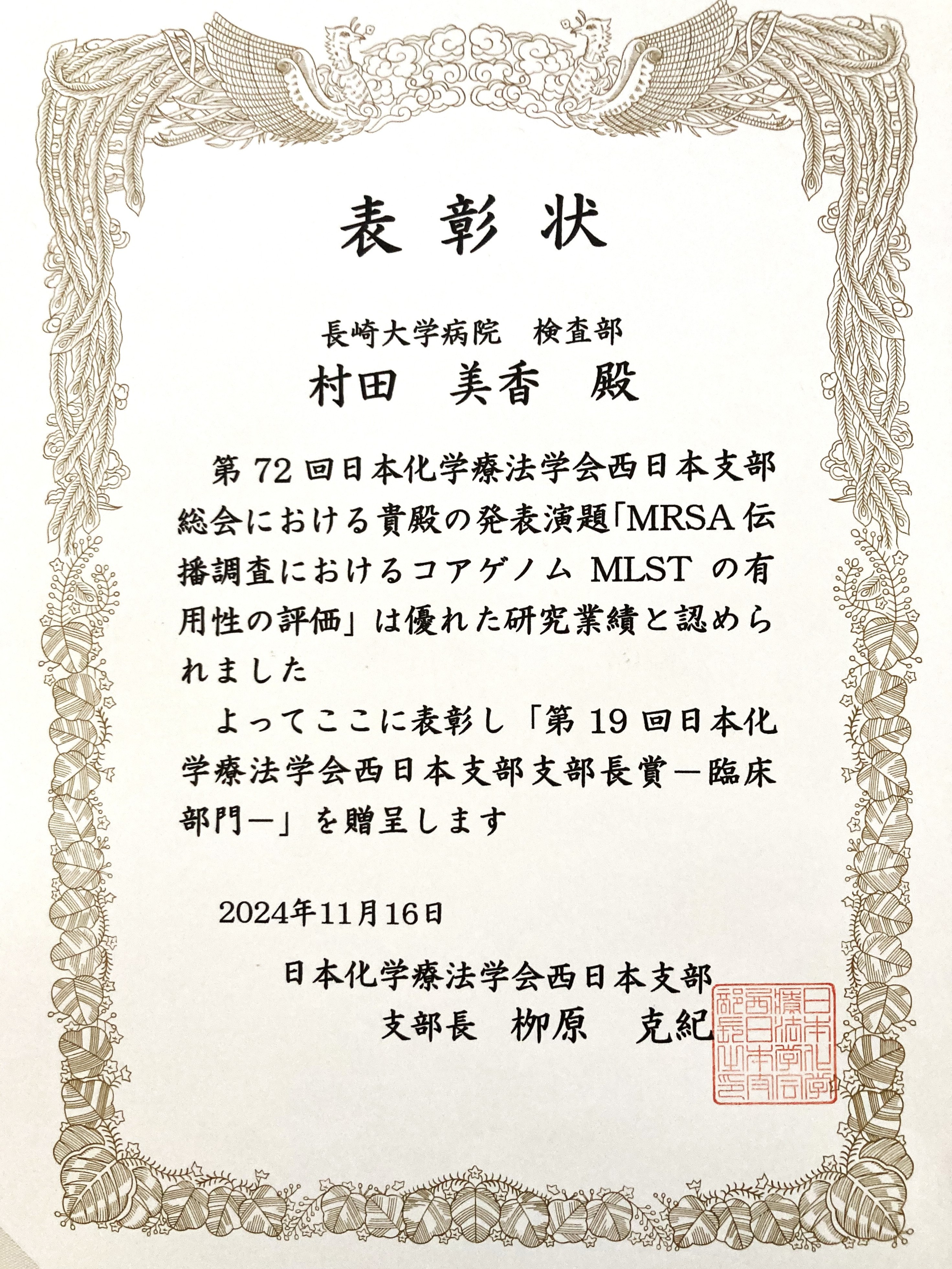 大学病院検査部の村田美香主任技師が、第72回日本化学療法学会西日本支部総会(神戸)において、「第19回日本化学療法学会西日本支部 支部長賞(臨床)」を受賞しました。