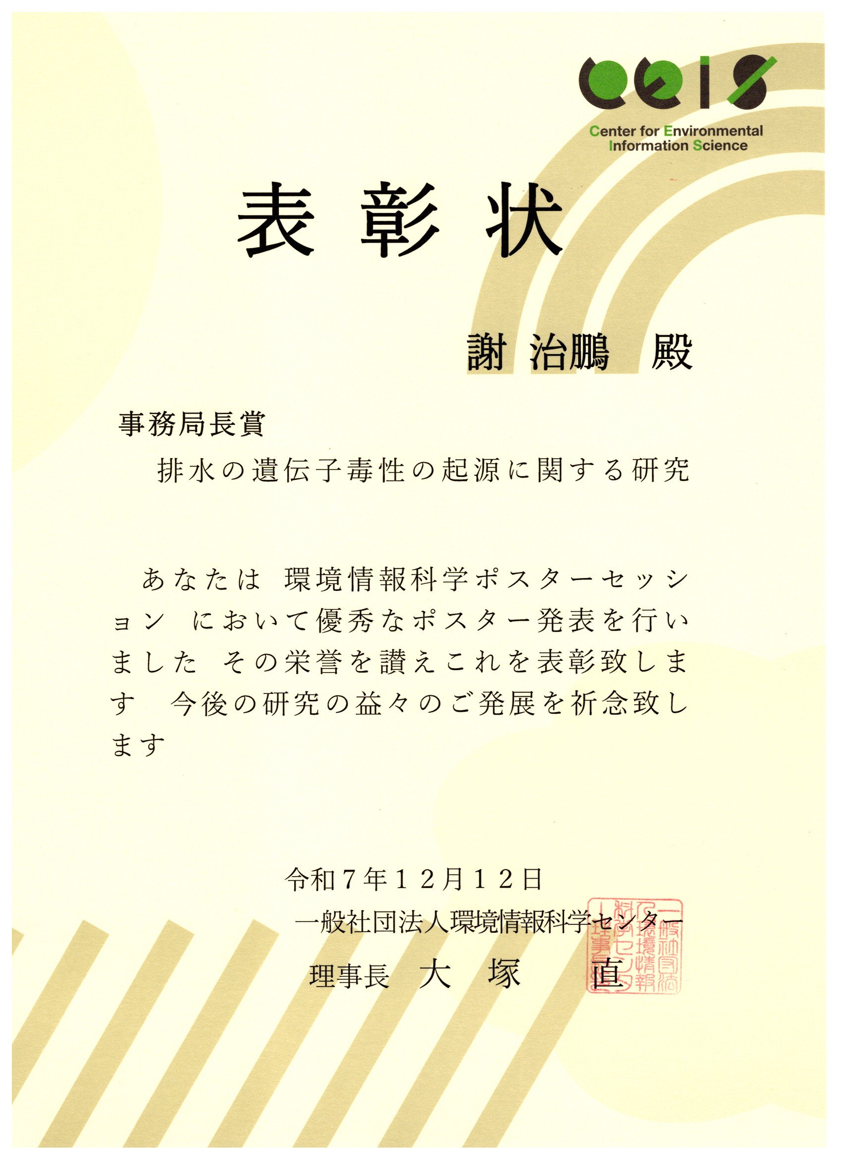 総合生産科学研究科 共生システム科学コース博士前期課程2年の謝治鵬さん(指導教員:久保隆助教)が、2025年12月12日(金)に東京都千代田区で開催された一般社団法人環境情報科学センター主催「第22回環境情報科学ポスターセッション」において、事務局長賞を受賞しました。